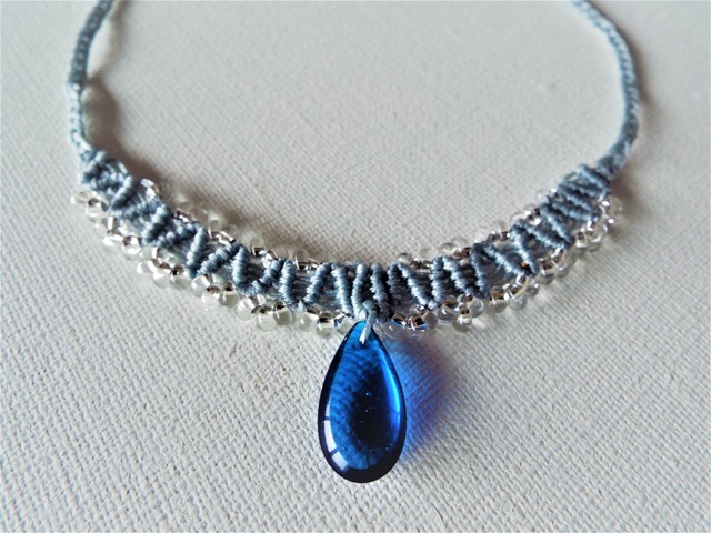 青いしずく型の石を真ん中に構え、 水色のマクラメ糸と透明のビーズで丁寧に編みこんだペンダントです。 後ろの留め具には直径1センチのクリスタルを用いています。 首回り 約43~44センチ 石の上の四角い部分 幅約11センチ、高さ約1センチ 青いしずく型の石の大きさ 幅約1.2センチ、高さ約2センチ ・マクラメ編みの特性上、編み終わりに焼き留め処理をする為に焼き後がございます。 ・なるべく近い色合いで撮影するようにしていますが使用するモニターの色により画像の色と商品が多少異なる場合がございます。