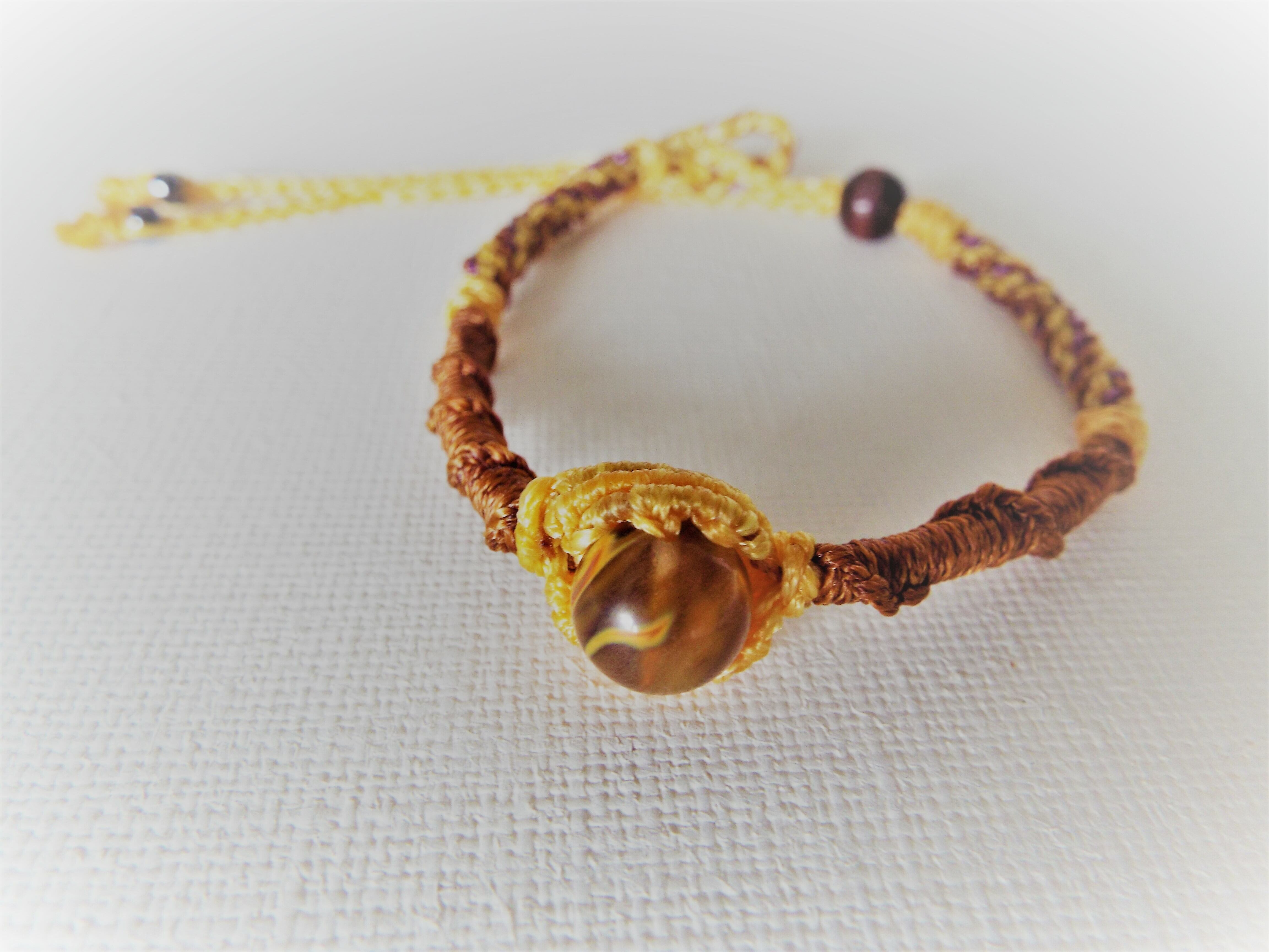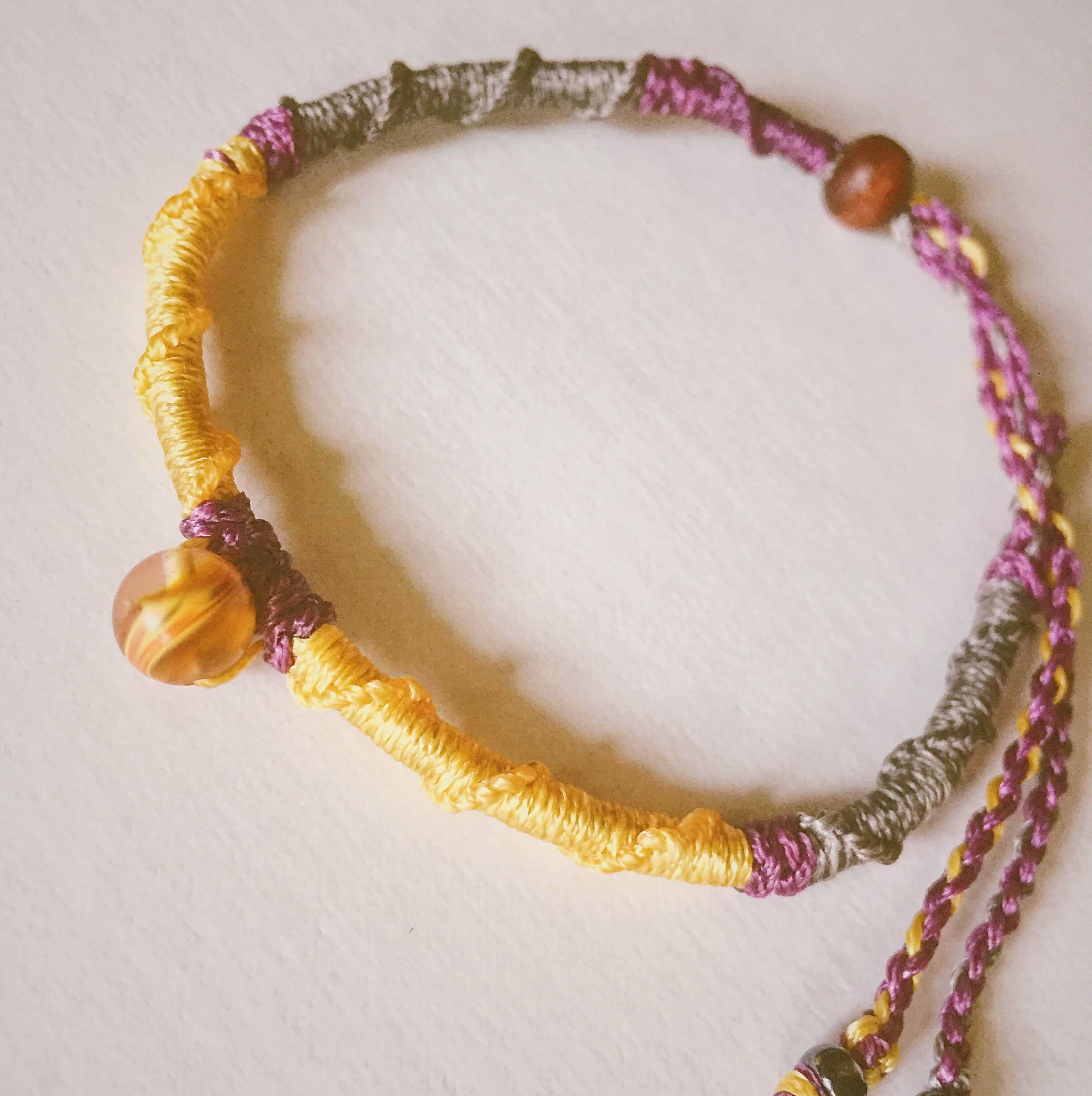 イエロー、グレー、パープルのマクラメ糸で、オレンジのサードオニキスを包みました。