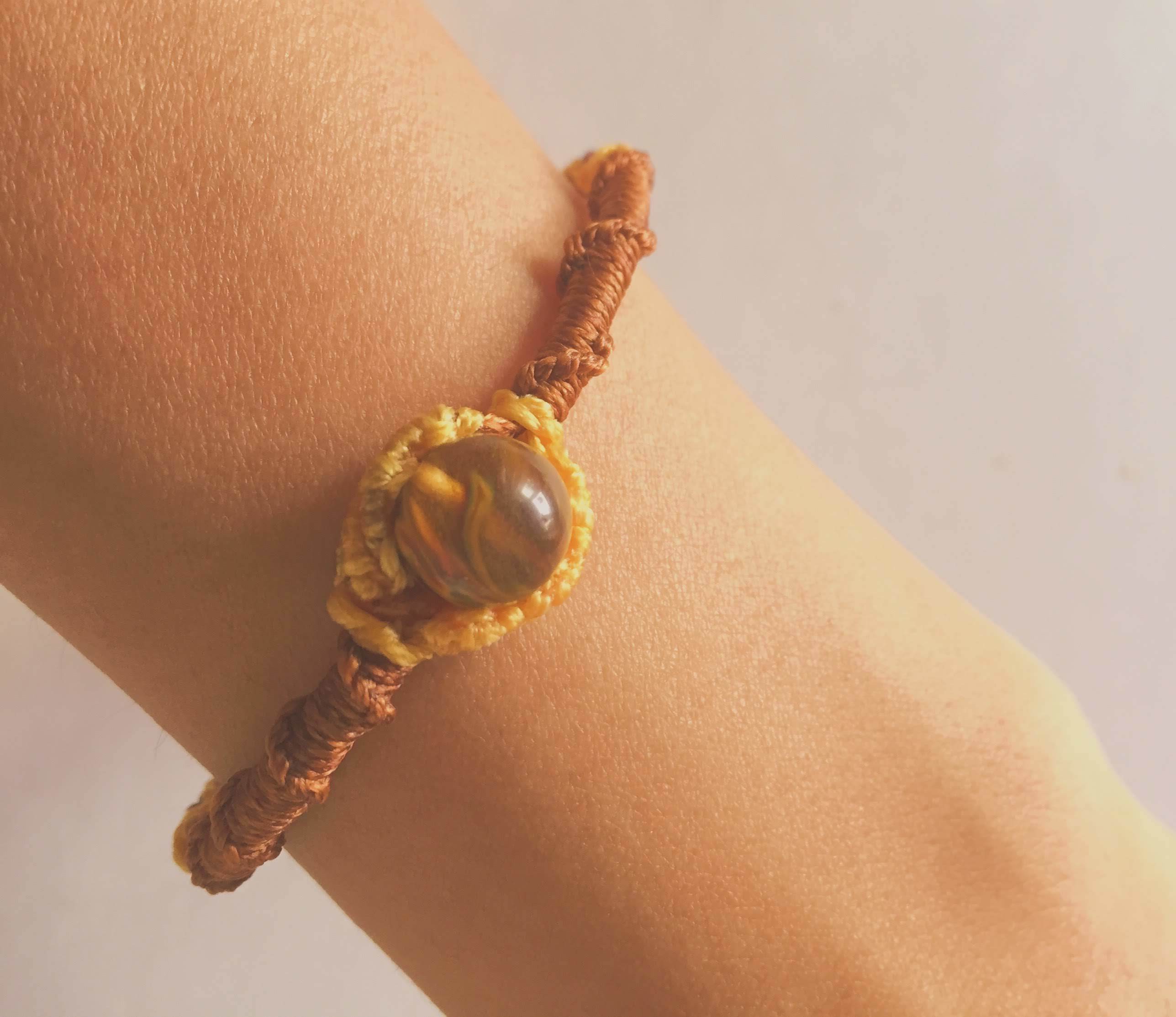 サードオニキスの周りは黄色のマクラメ糸で取り囲み、その外を茶のマクラメ糸で、手首側は紫と茶、黄色で4つ畳みという編み方で頑丈につくっています。