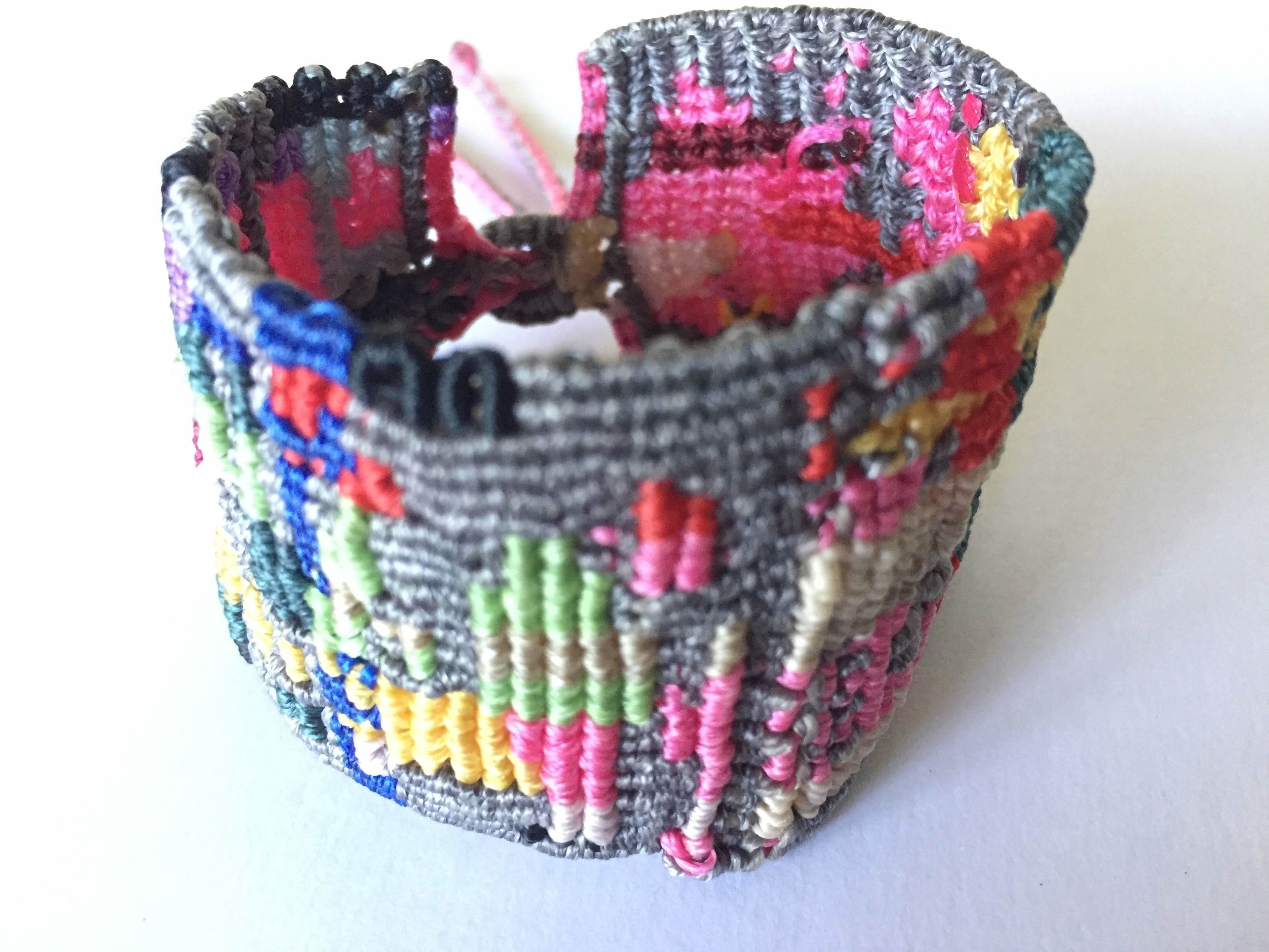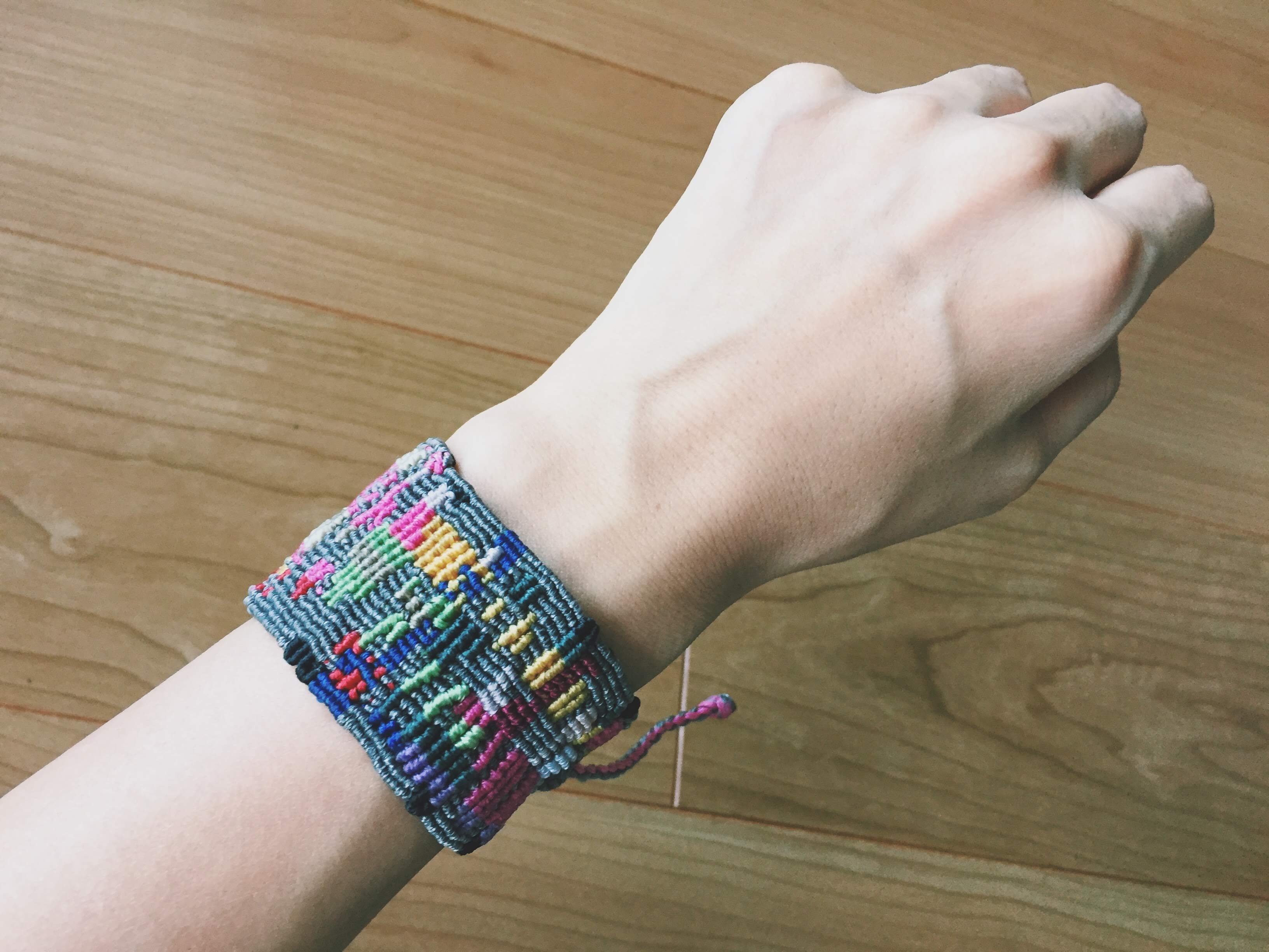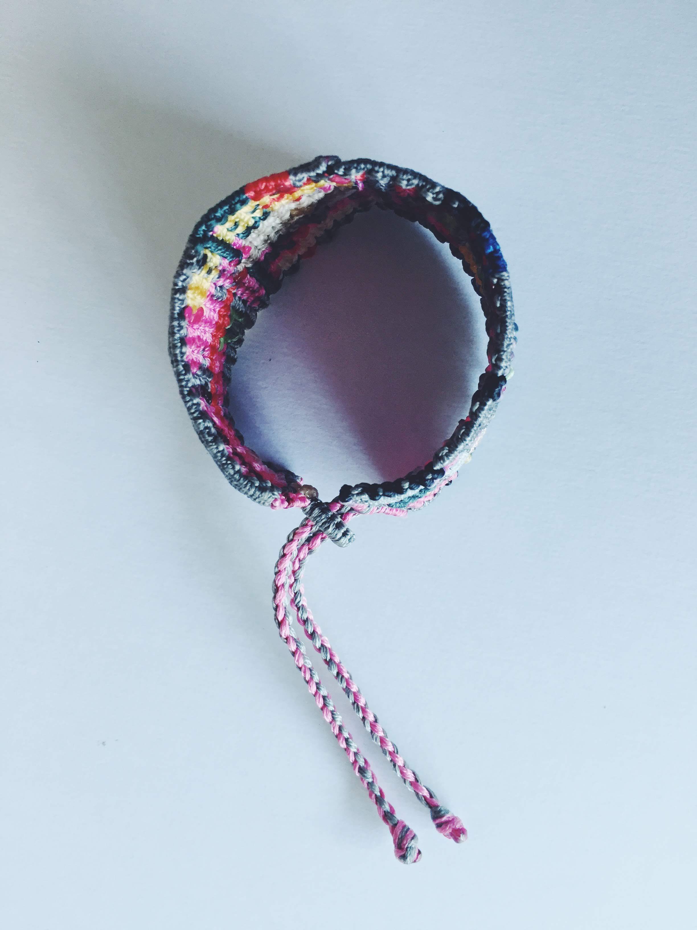 グレーをベースにピンク、赤、黄緑、黄、ブルーなどカラフルなマクラメ糸をのせて作成しました。