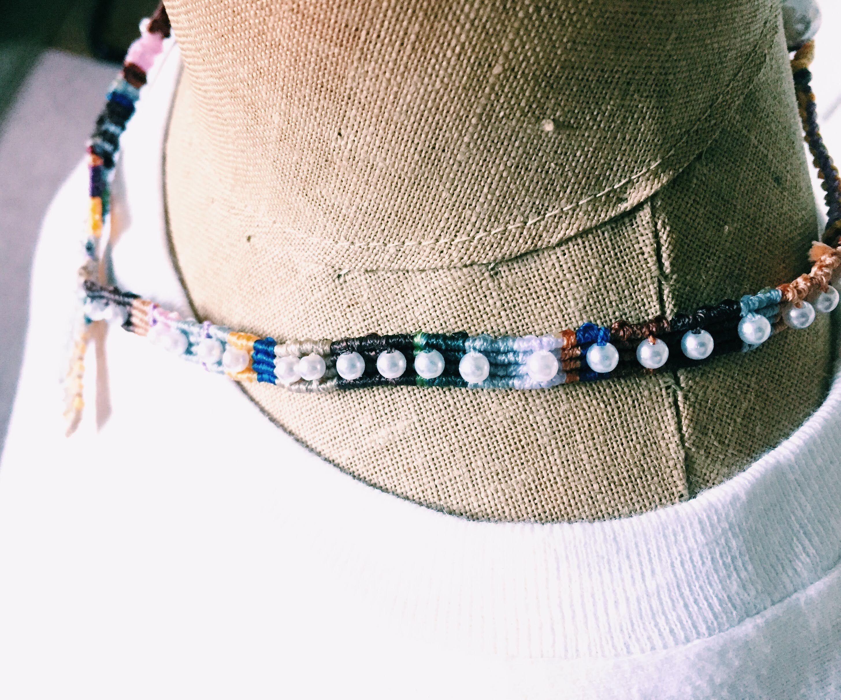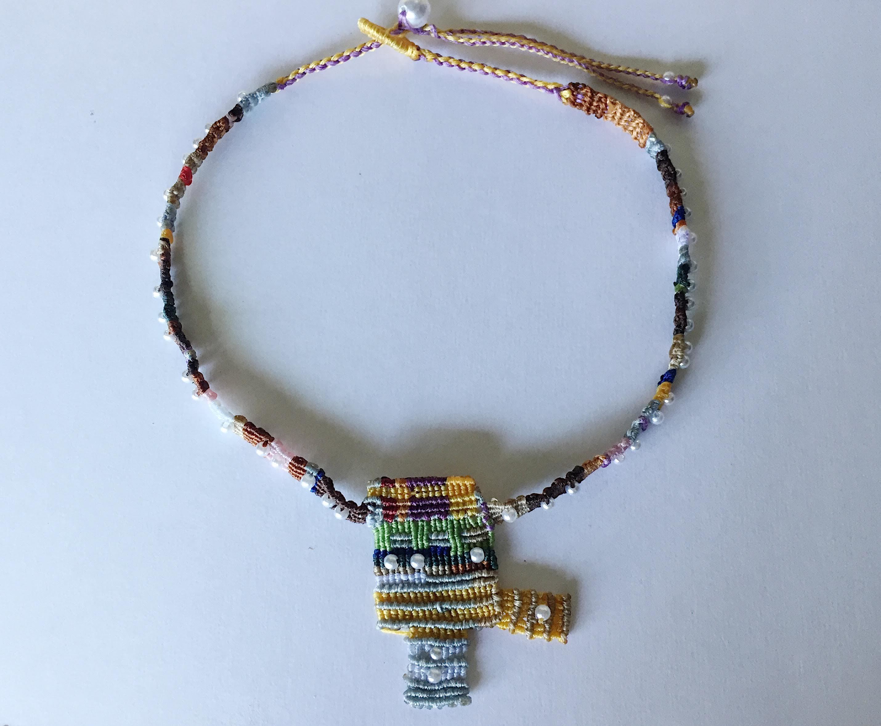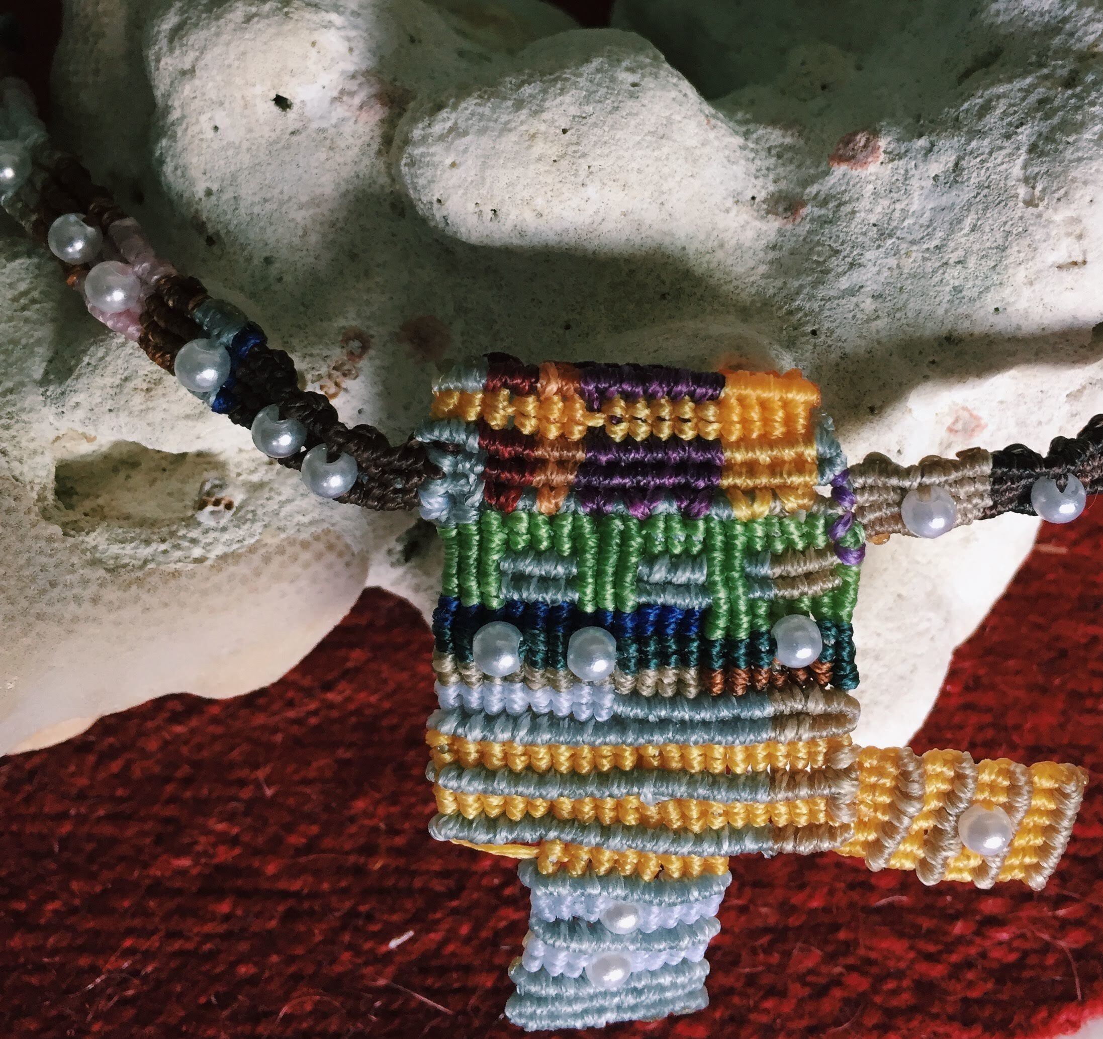イエローをベースにグリーン、水色、白、紫などカラフルなマクラメ糸をのせて作成しました。