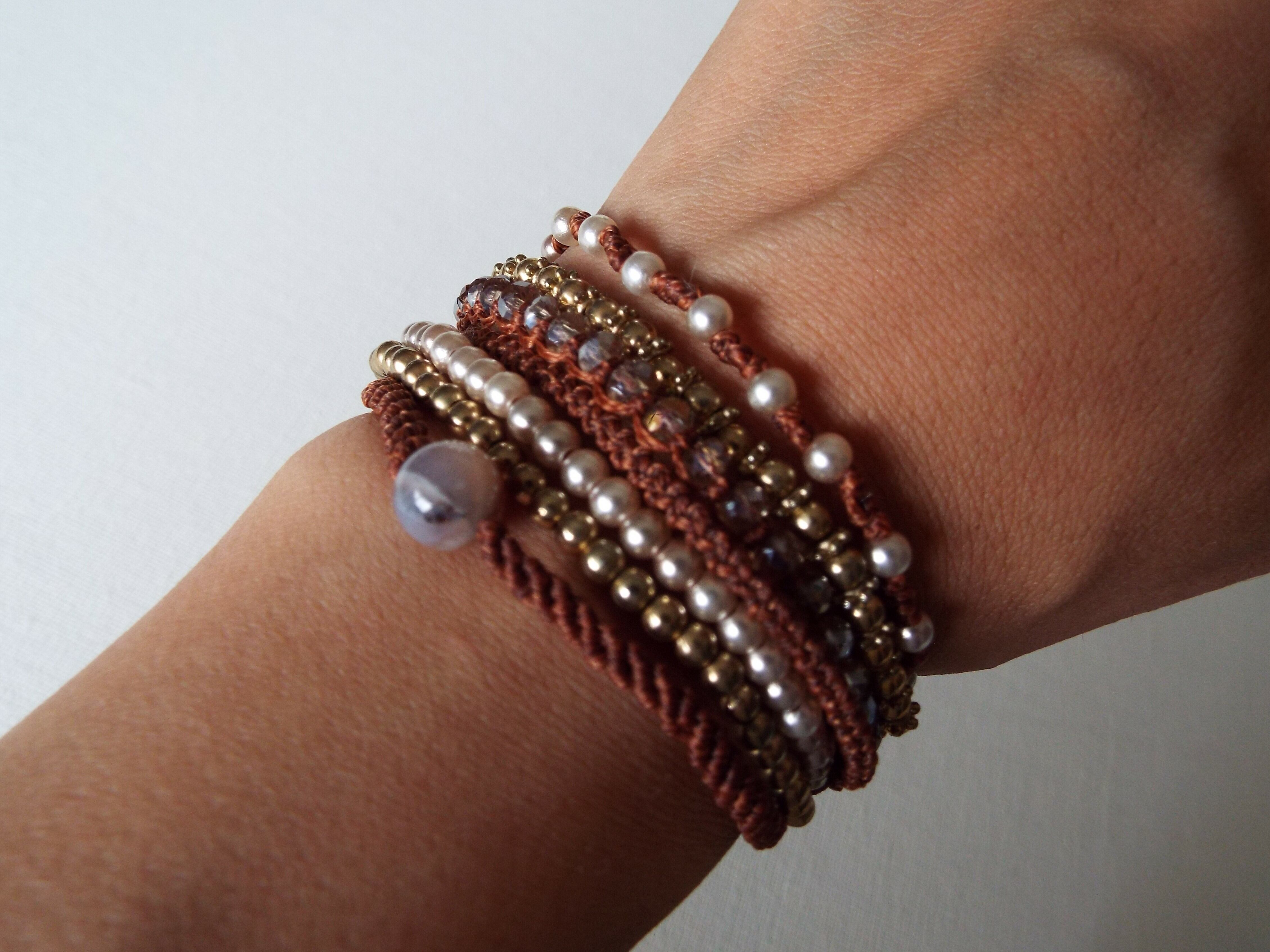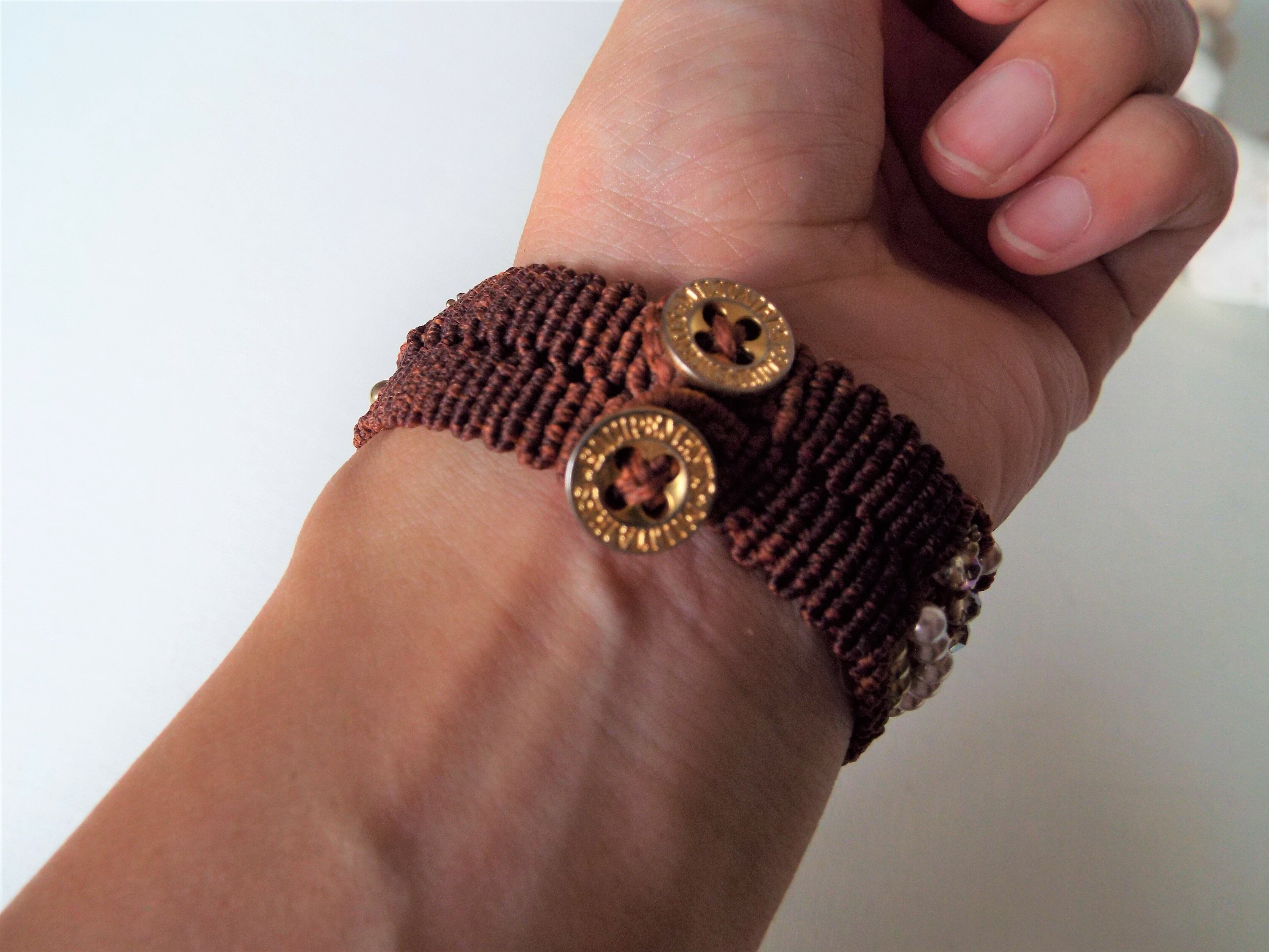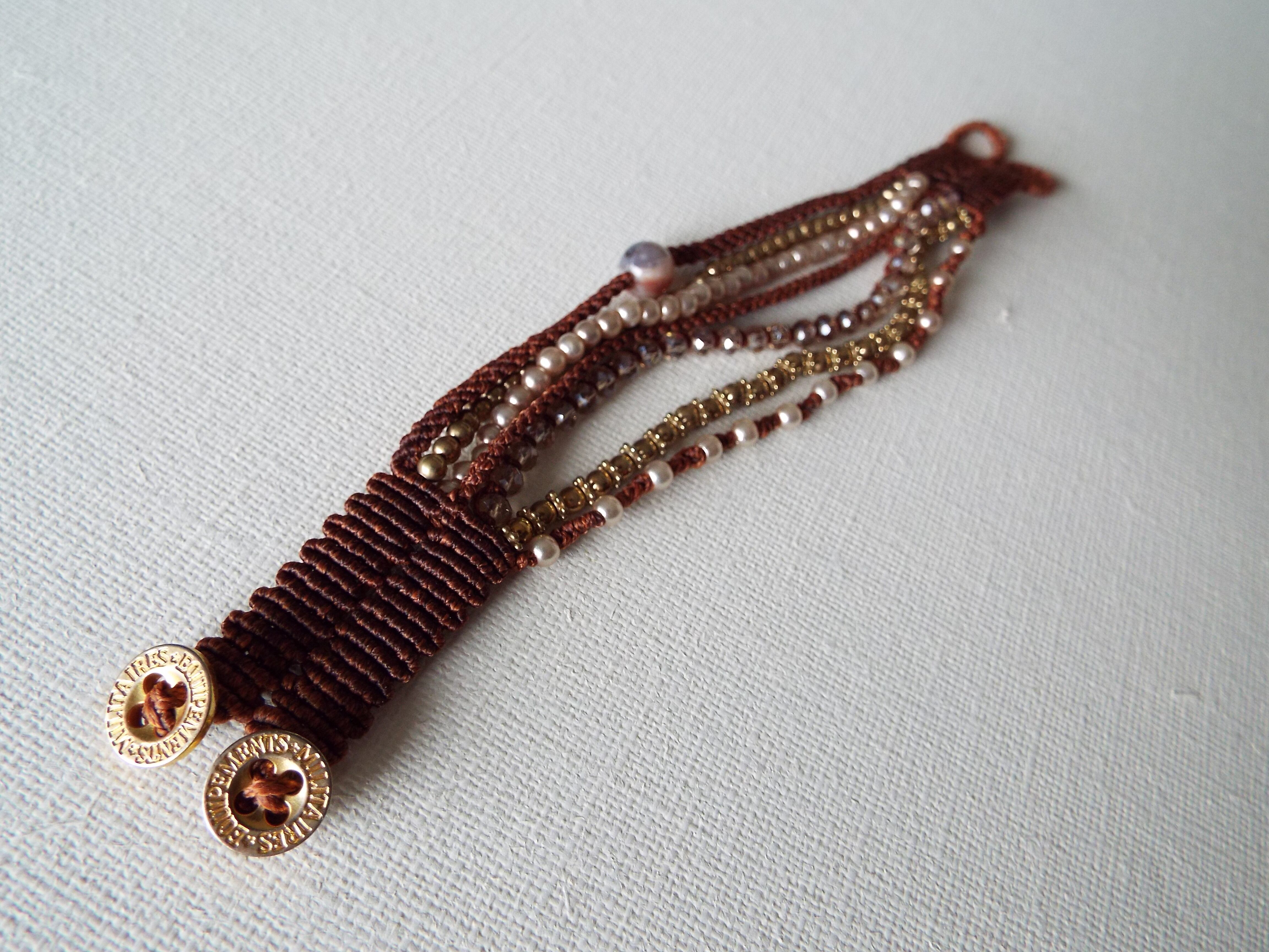 いろいろな種類のビーズを編み込んだブレスレットです。