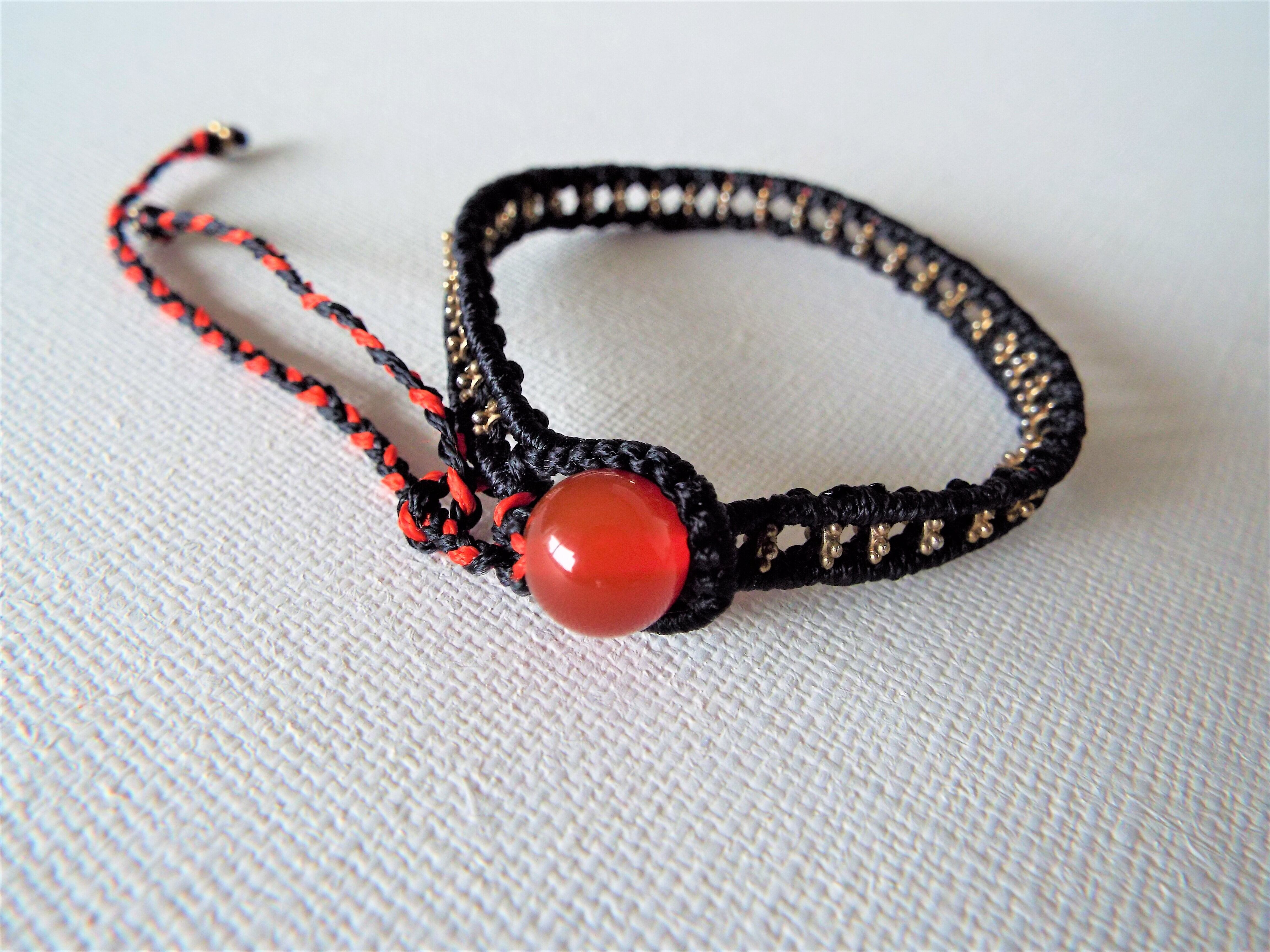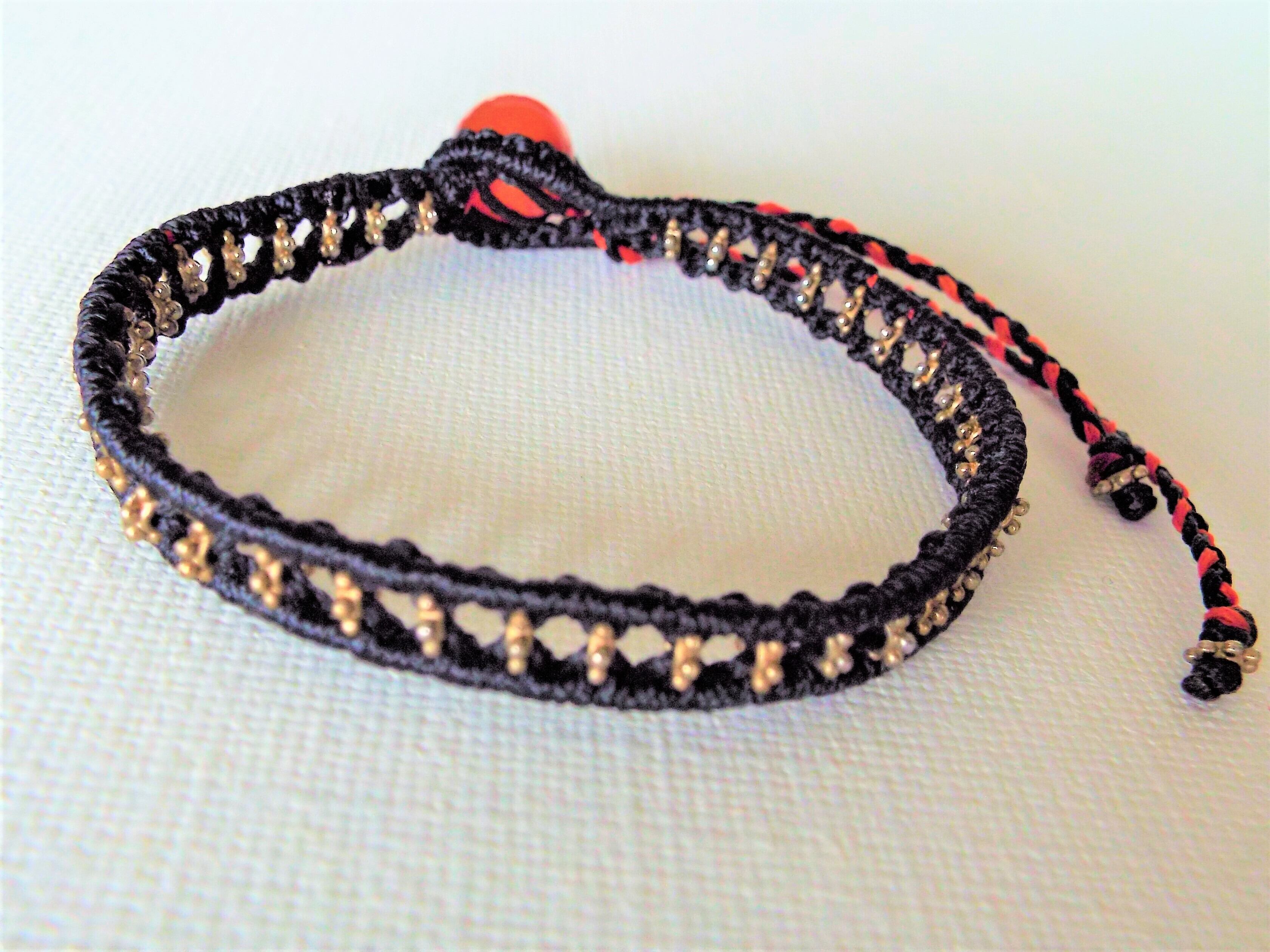 小さい金のビーズを入れた、強い印象の黒いブレスレットです。