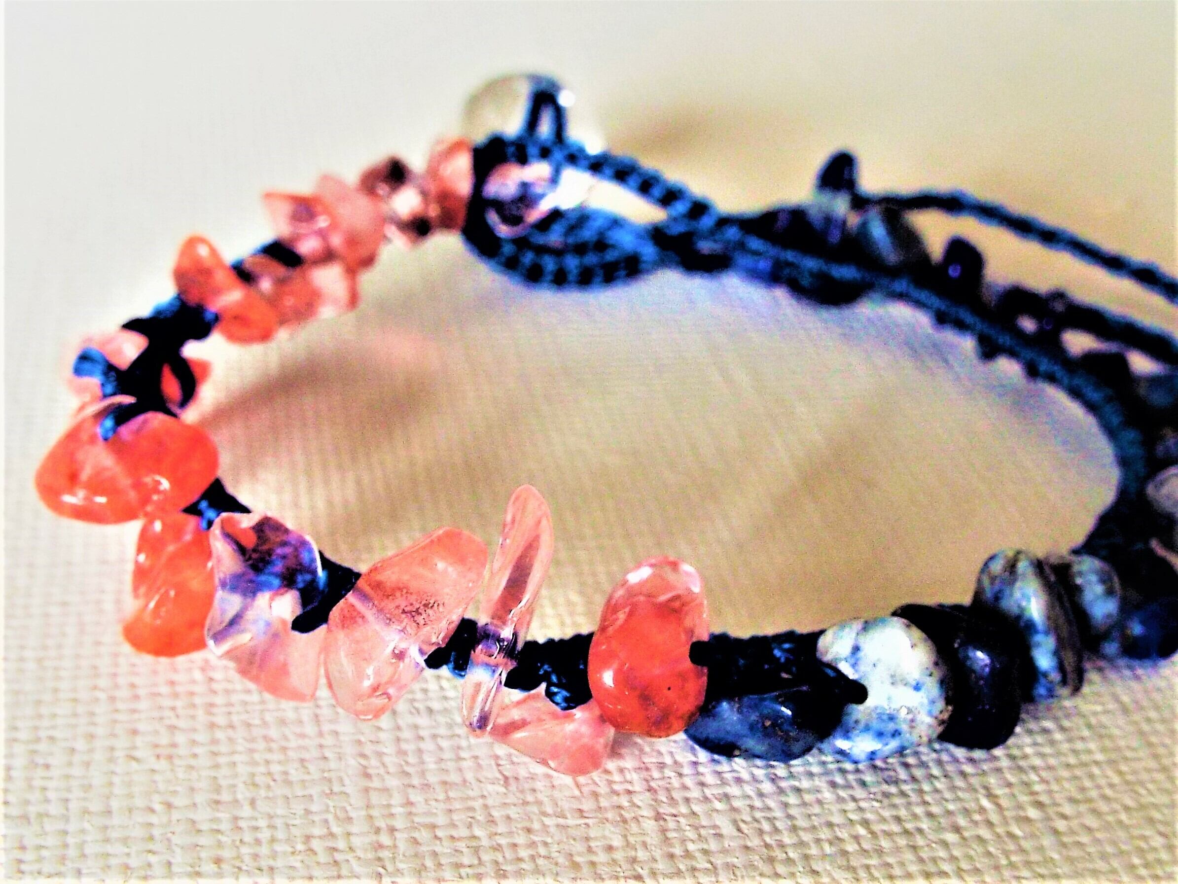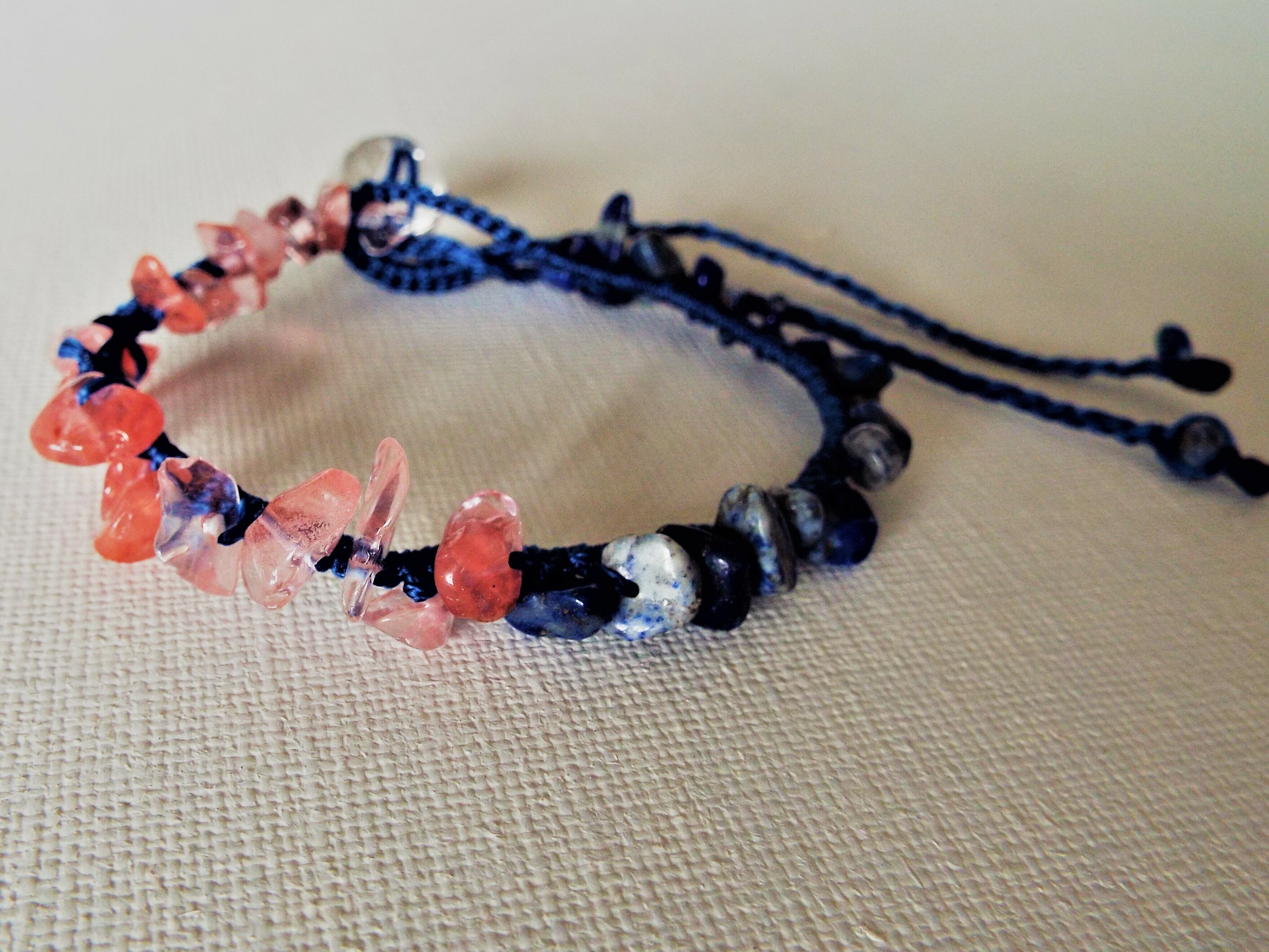 赤と青のビーズのブレスレットです。