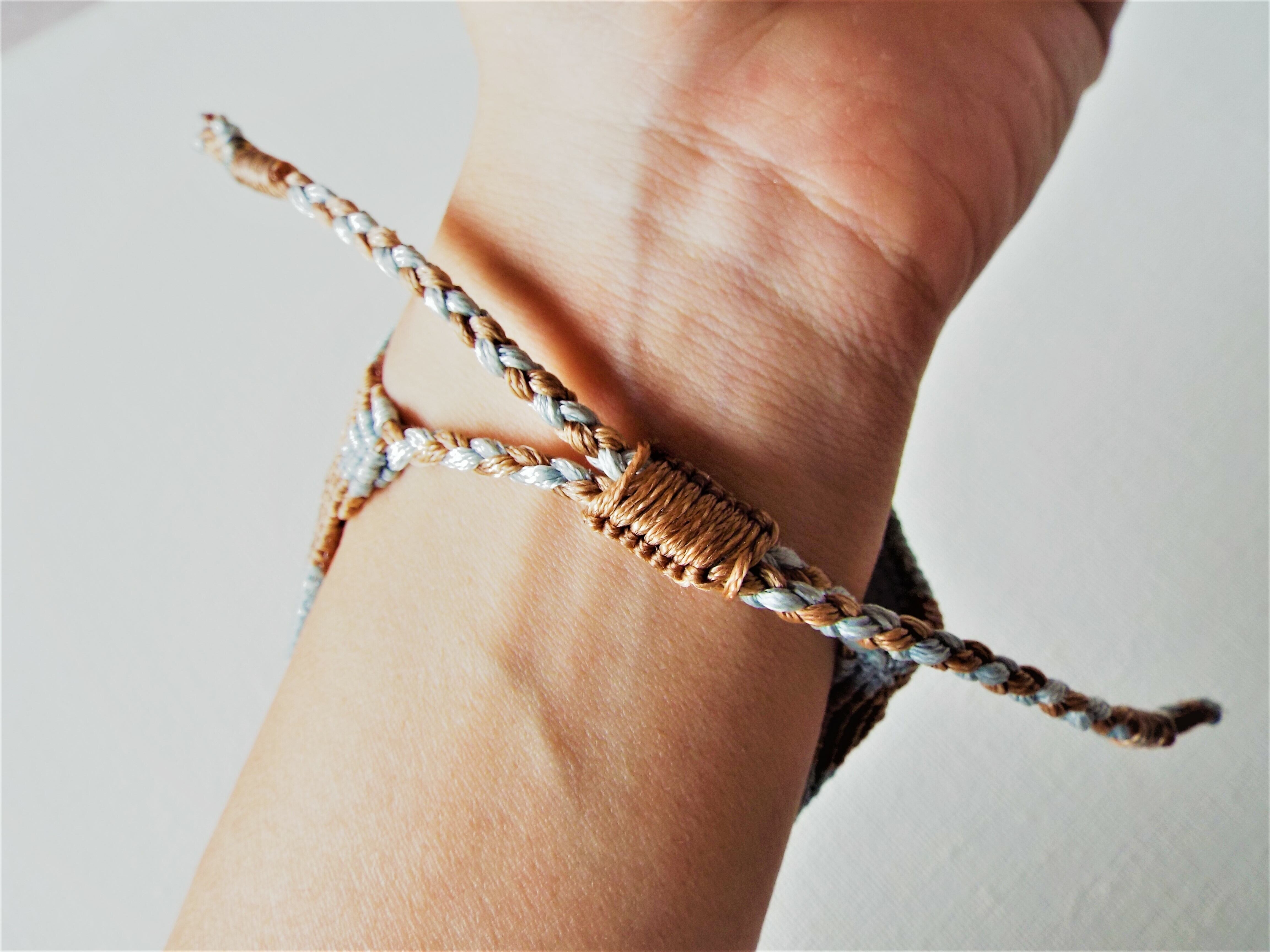 アベンチュリンとアメジストを茶色と水色のマクラメ糸で丁寧に編み上げたブレスレットです。