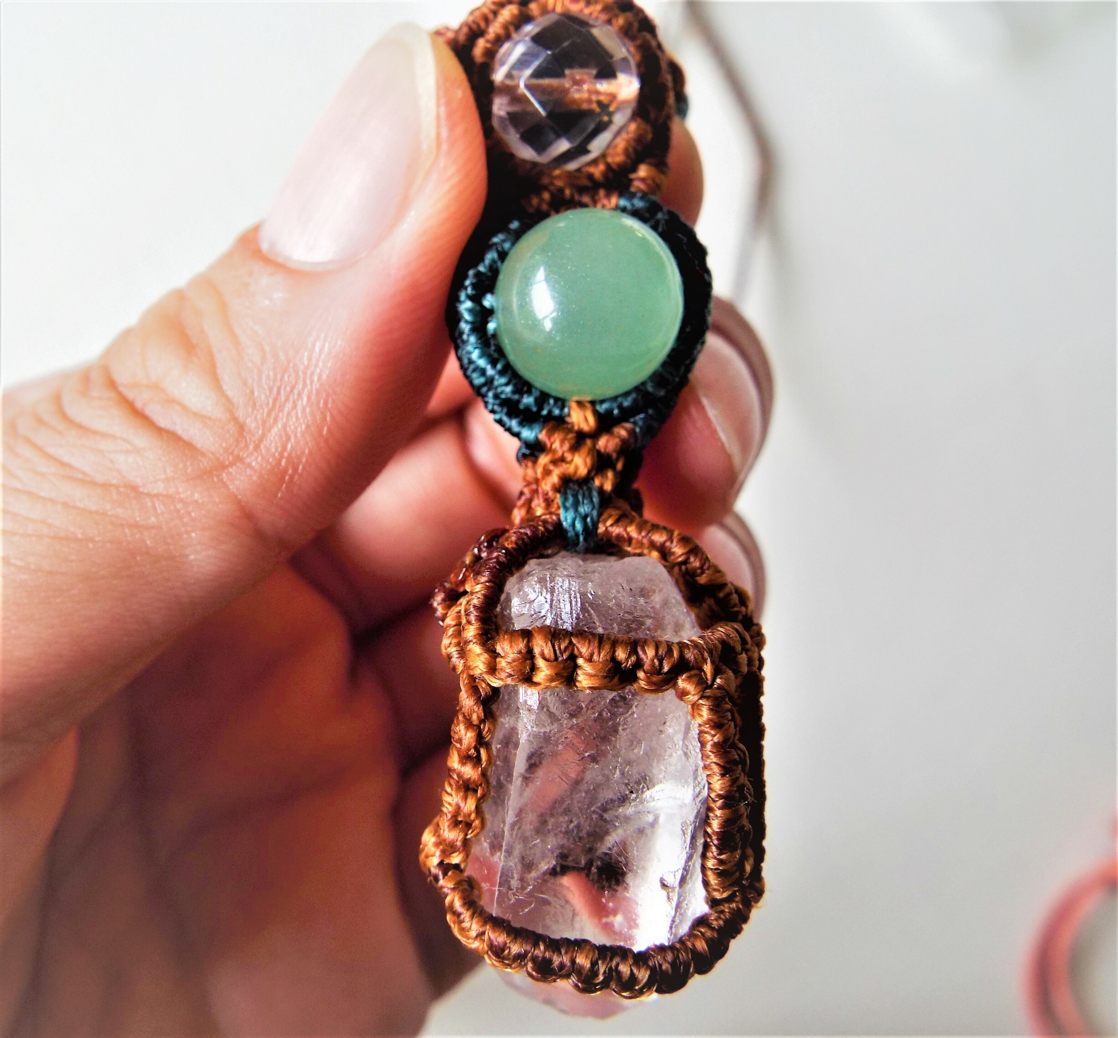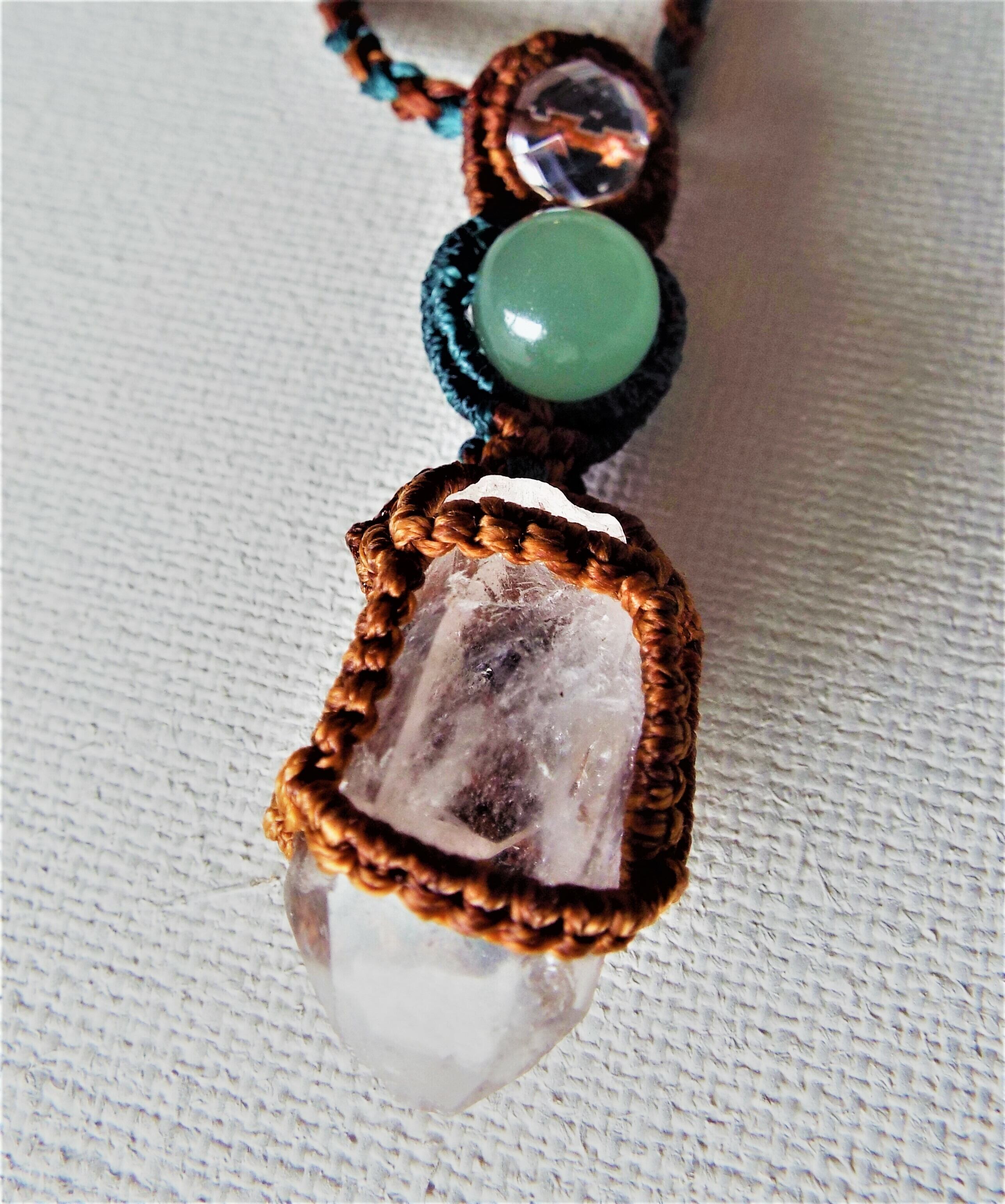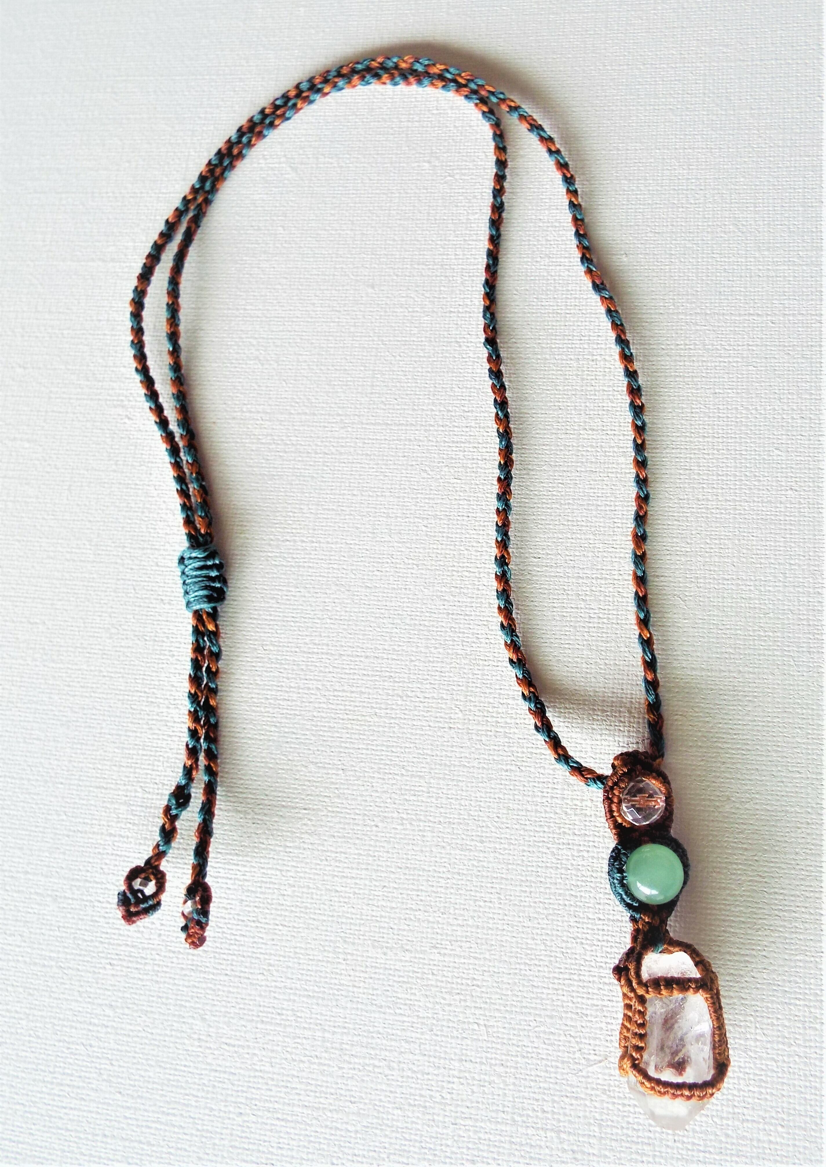 水晶とアベンチュリンを茶色のマクラメ糸で丁寧に編み上げたネックレスです。
