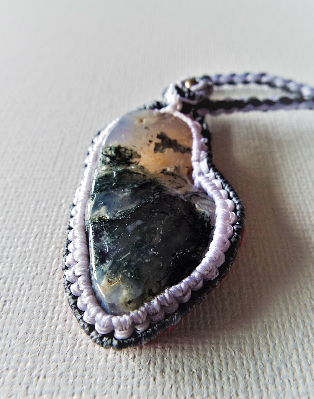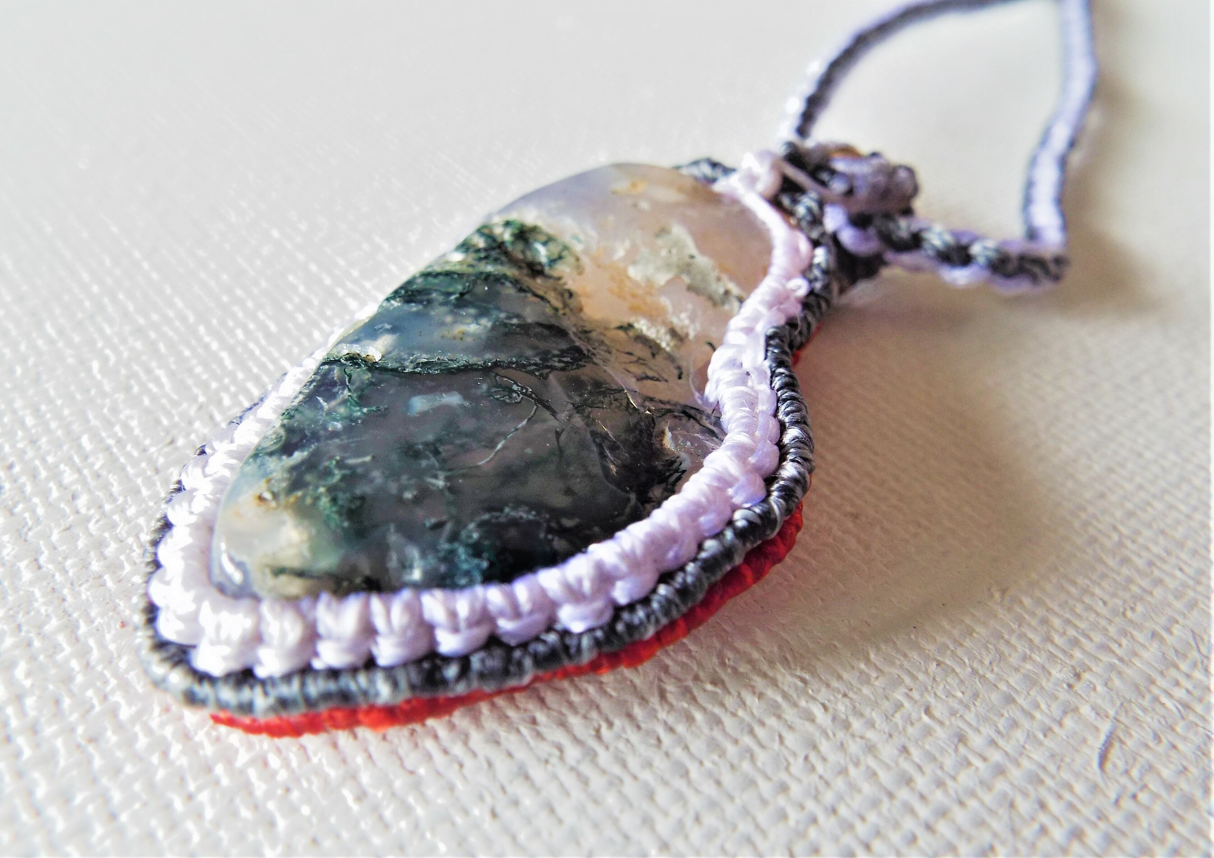 緑水晶を白と灰色と赤のマクラメ糸で編み上げたペンダントです。