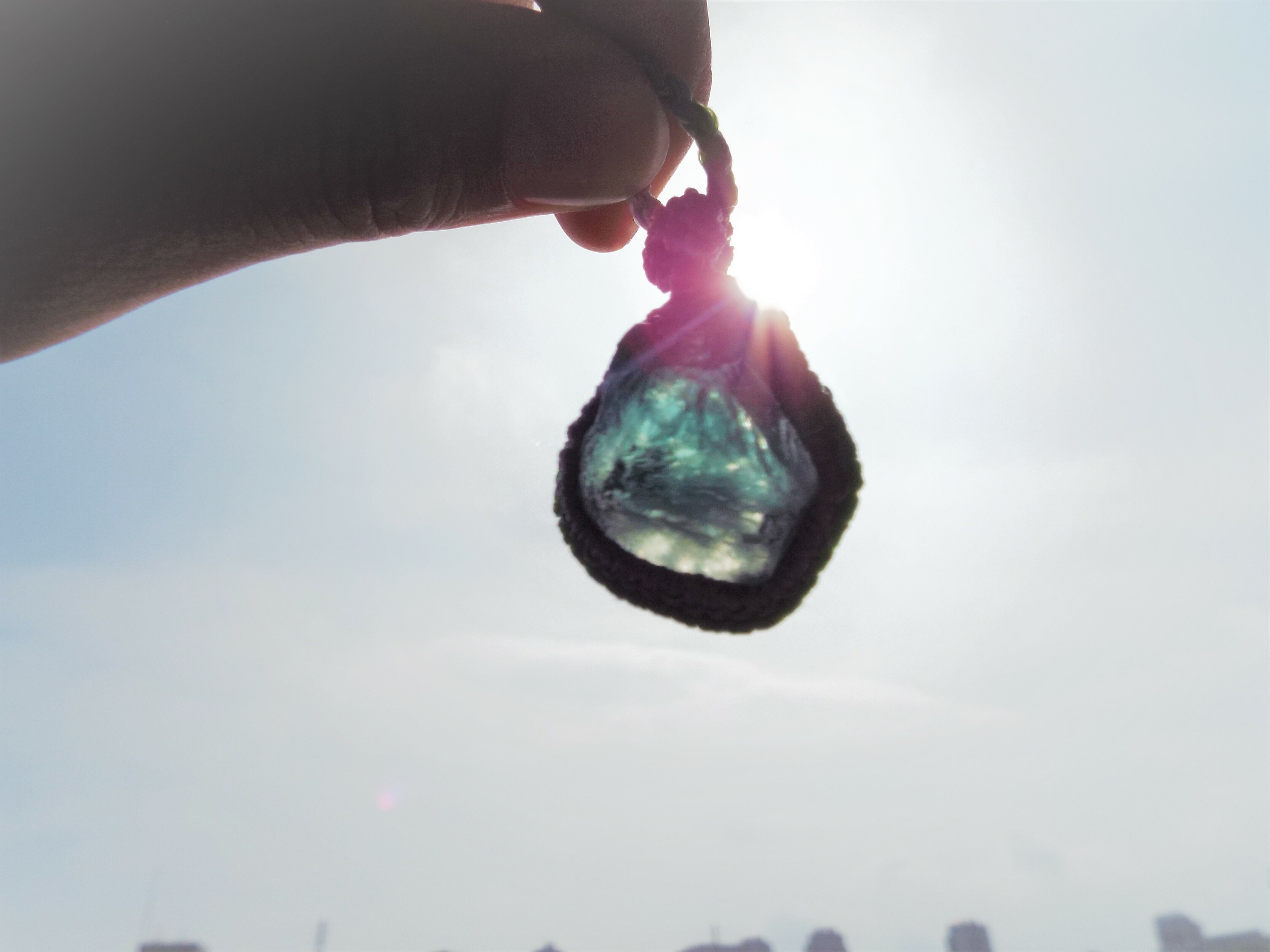 グリーンフローライトを水色と黄緑色のマクラメ糸で丁寧に編みこみました。