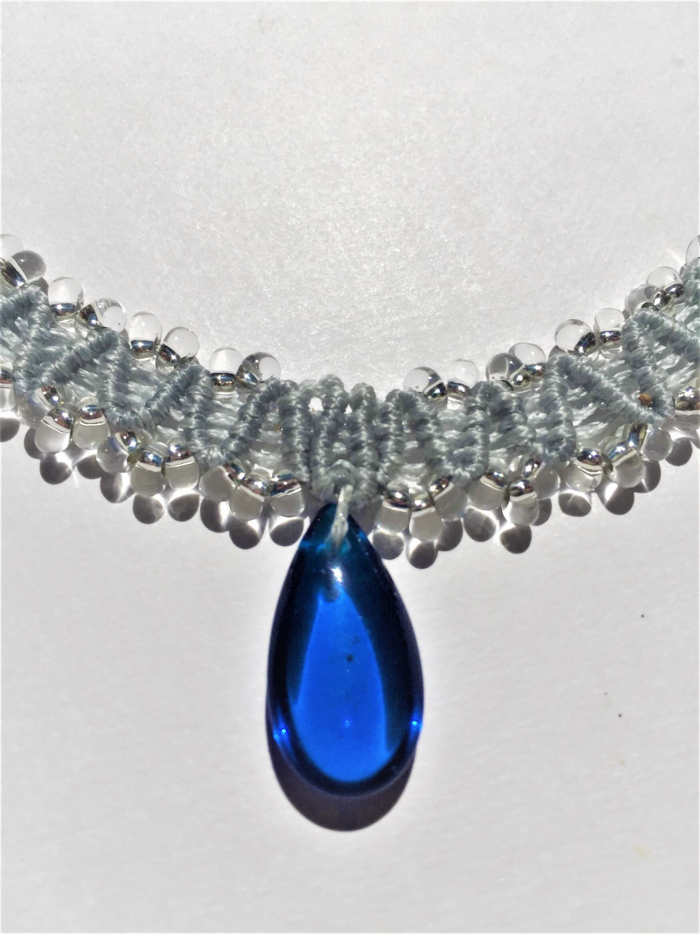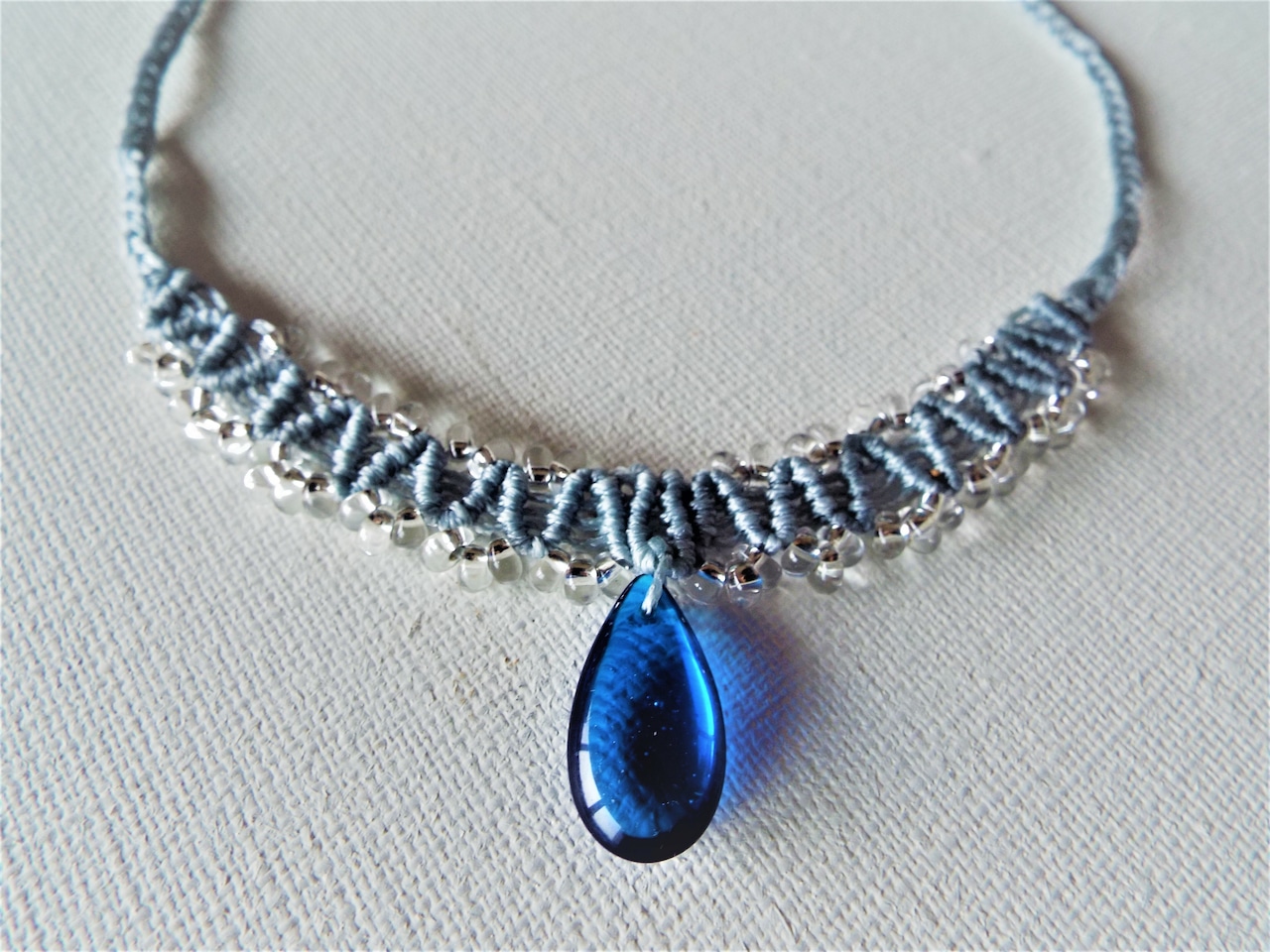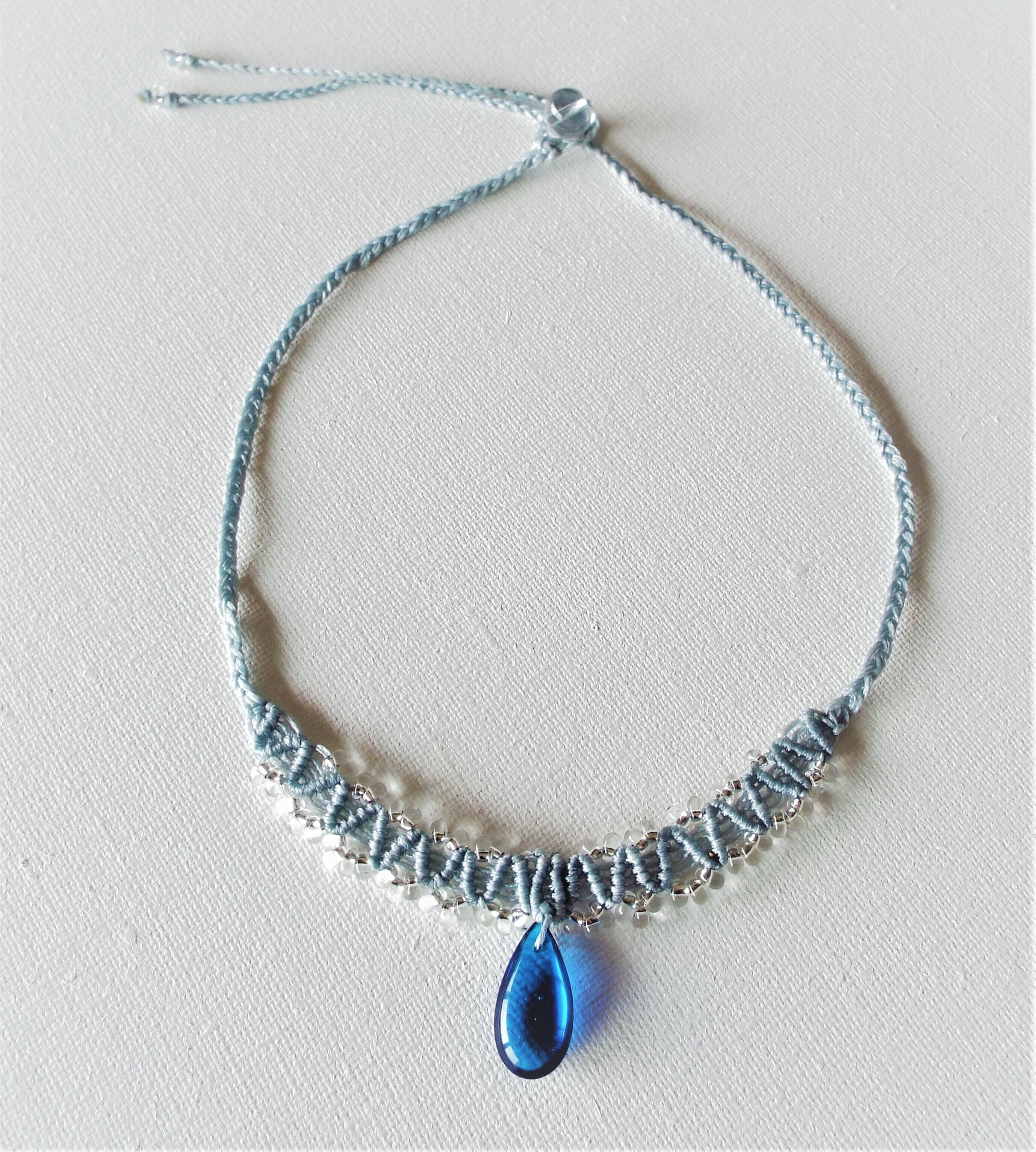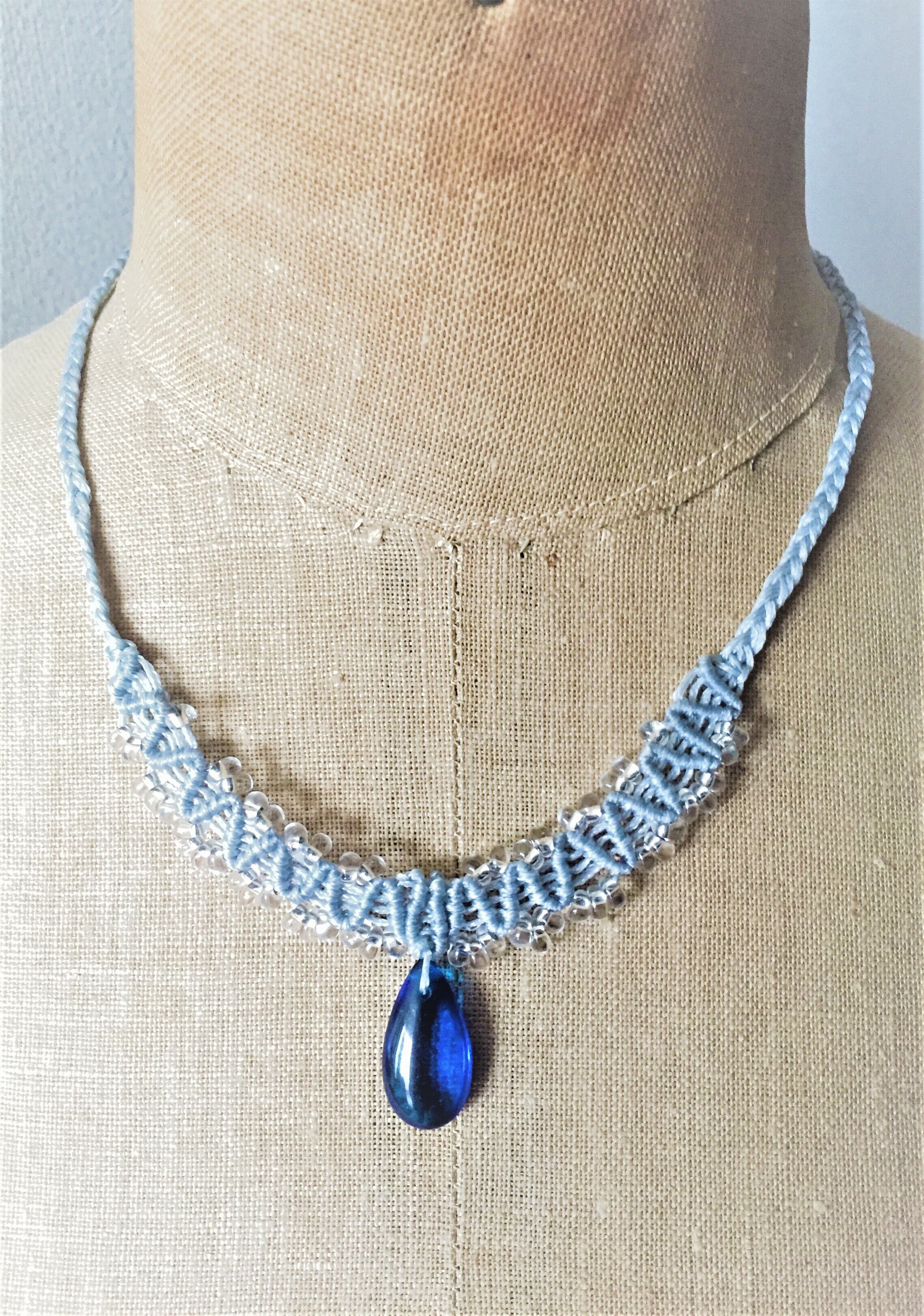 水色のマクラメ糸と透明のビーズで丁寧に編みこんだペンダントです。