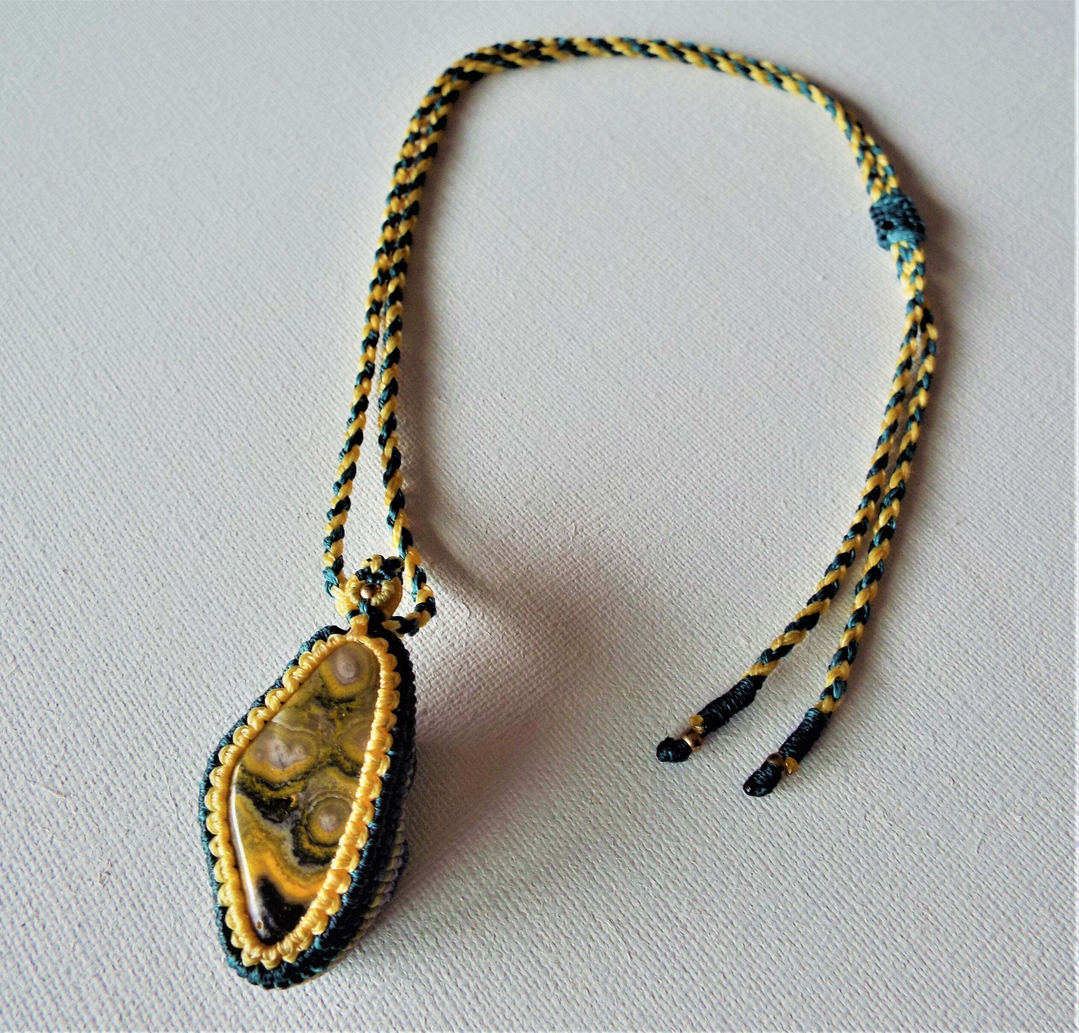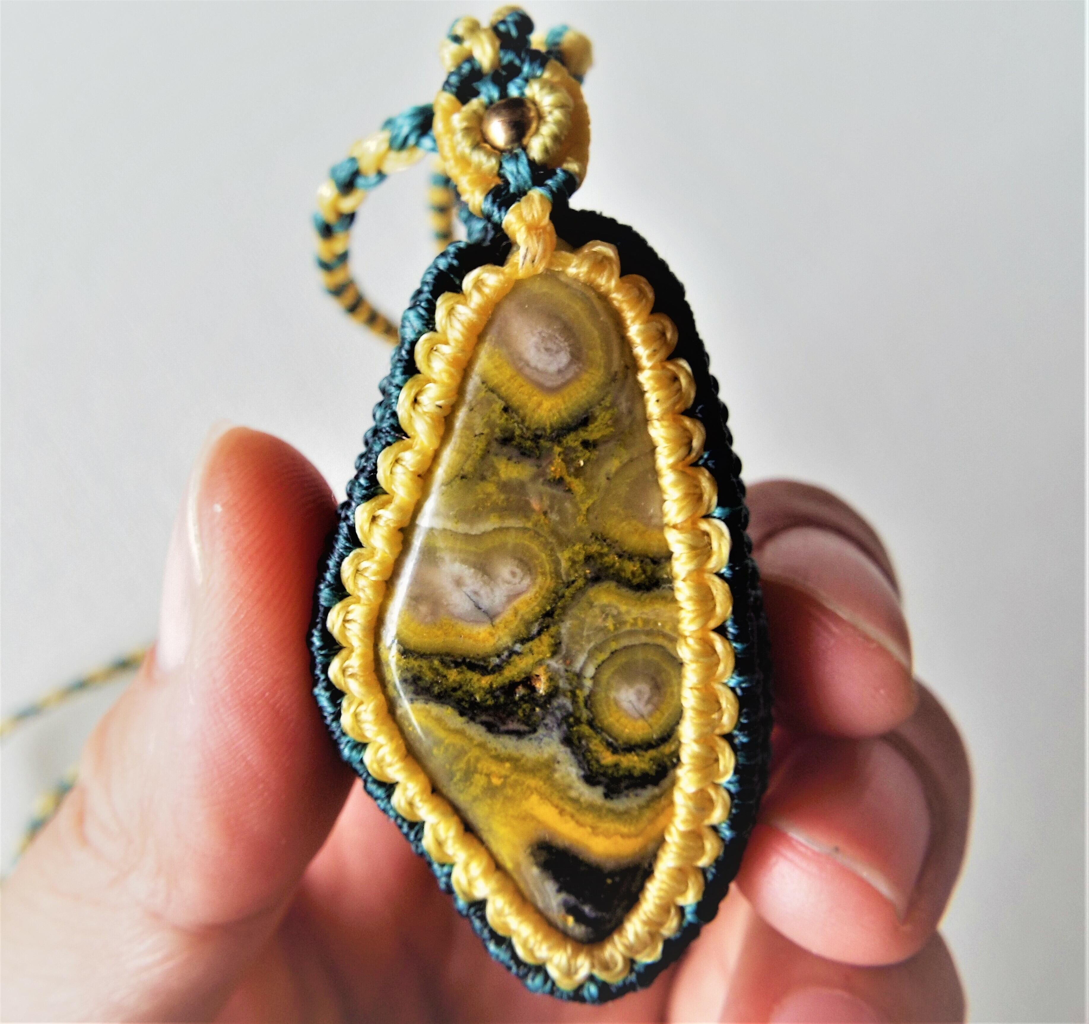 バンブルビージャスパーを黄色、緑、ピンクのマクラメ糸で丁寧に編みこみました。