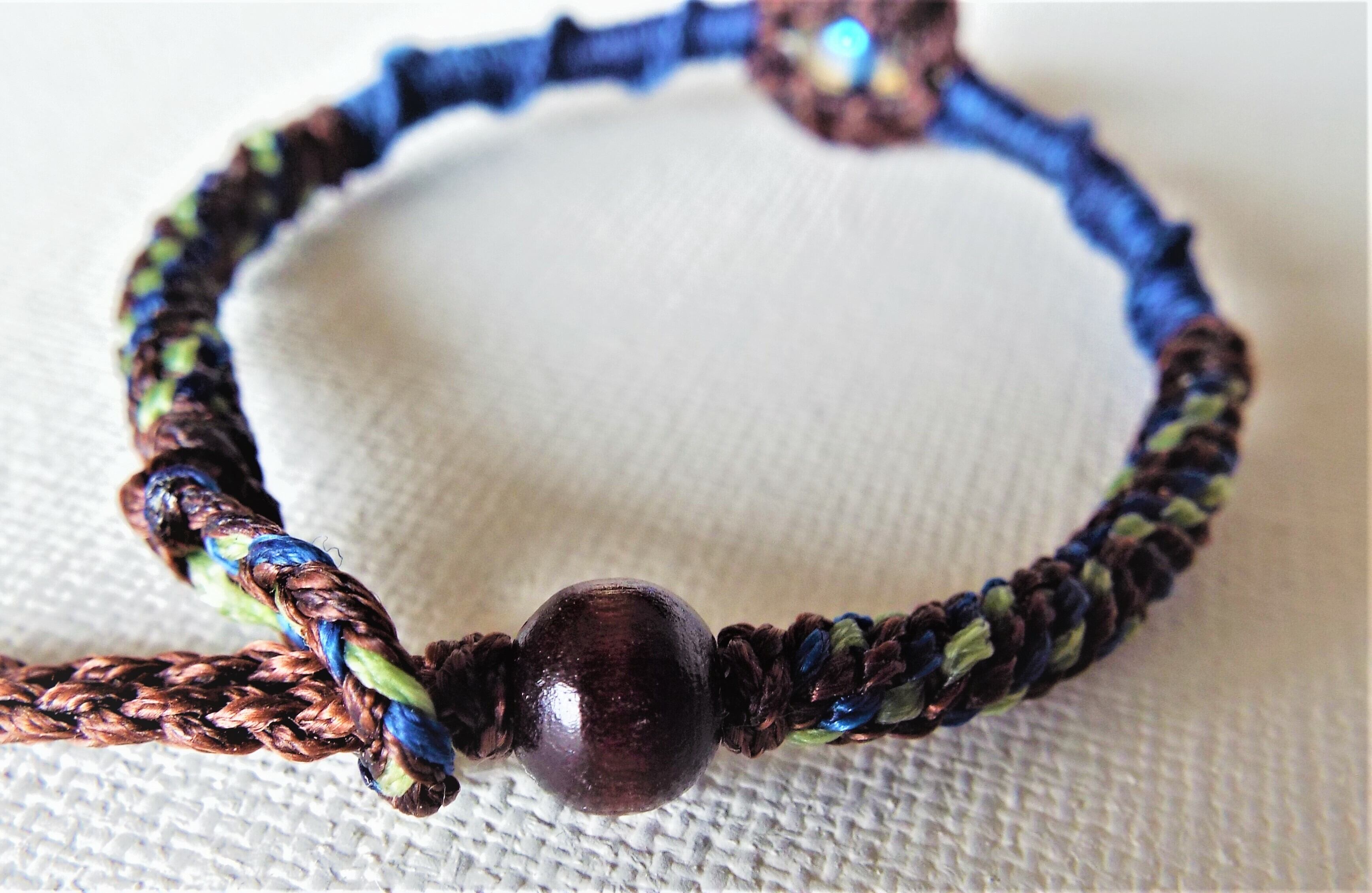 その外周を青色で結び、途中から茶色と黄緑で4つ畳みという結び方で編んでいます。