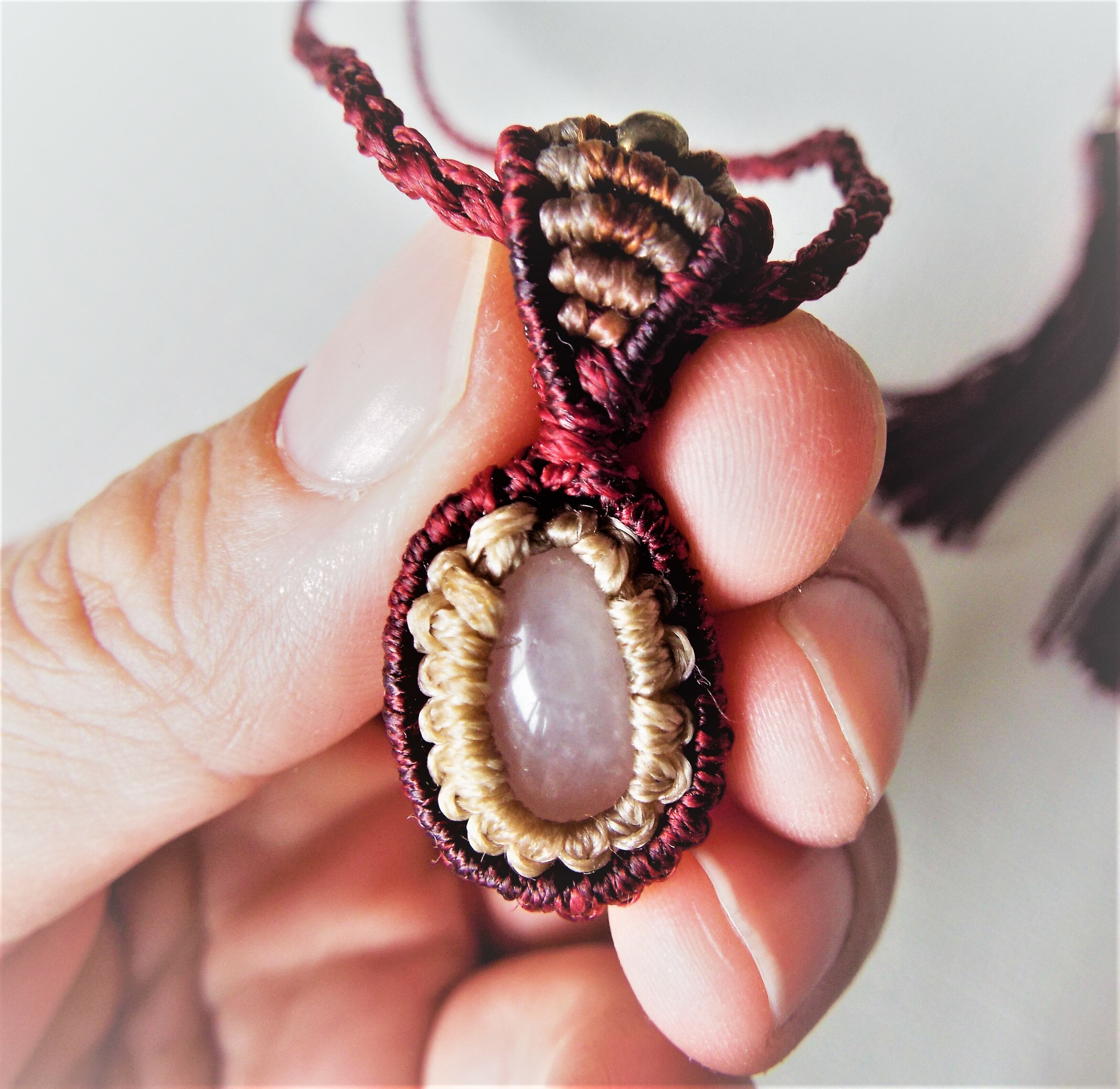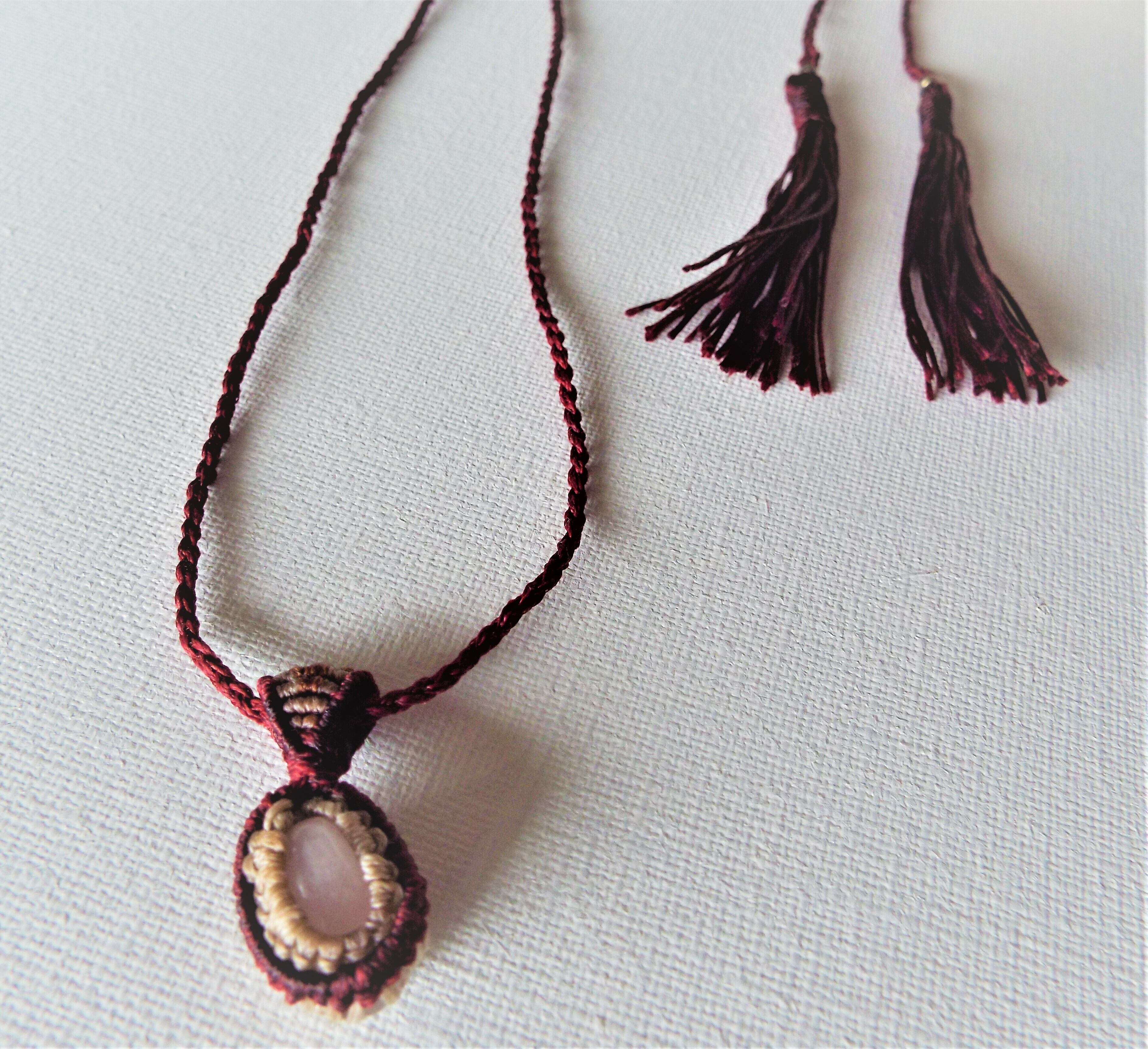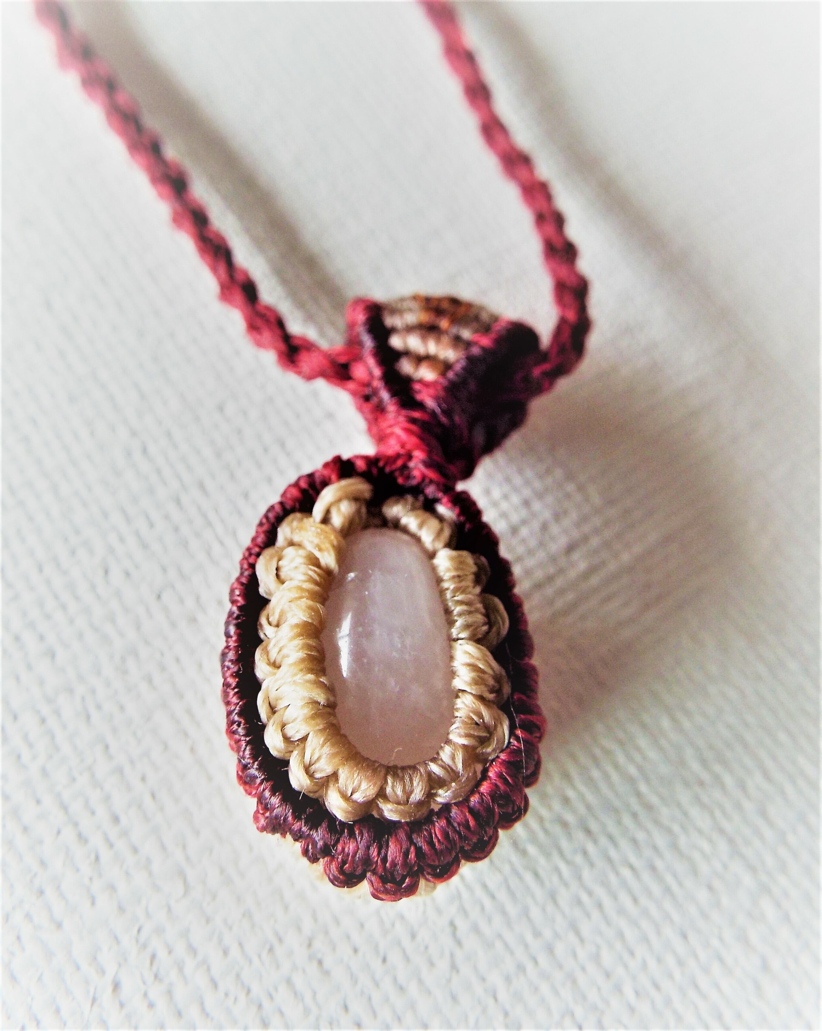 ローズクォーツをベージュと赤紫のマクラメ糸で囲んでいます。