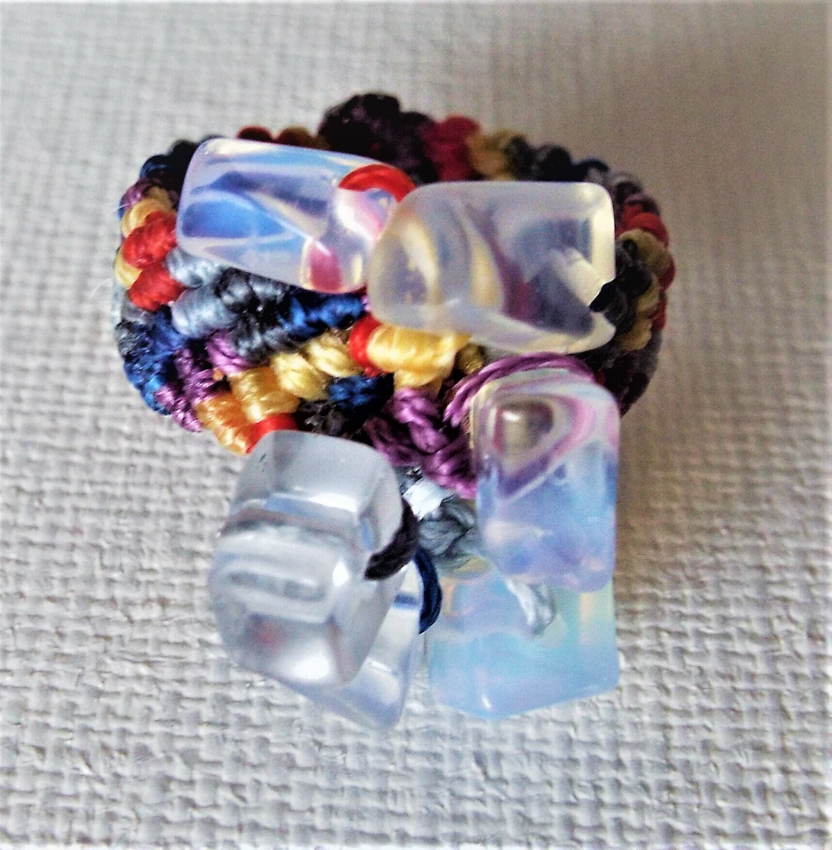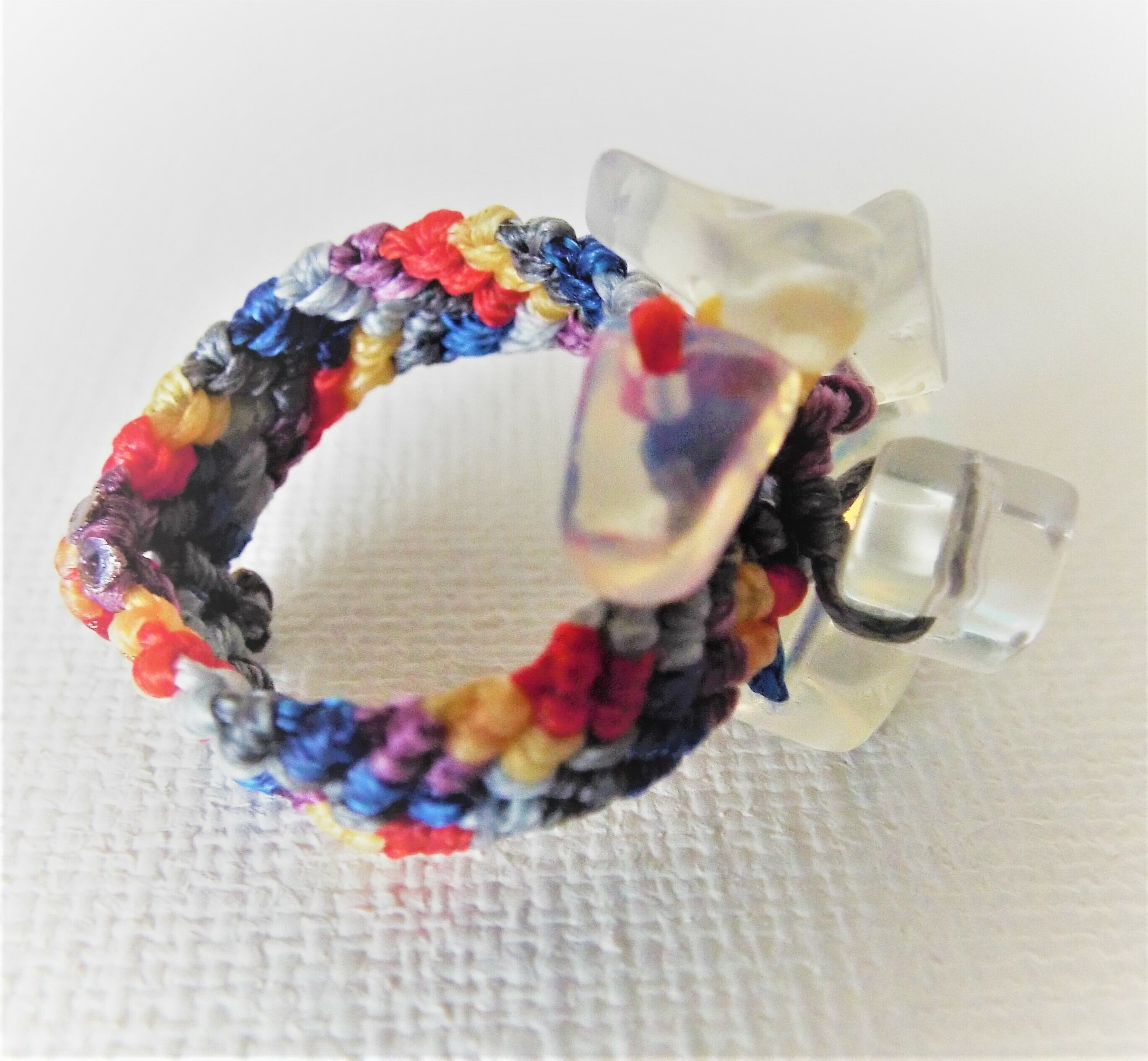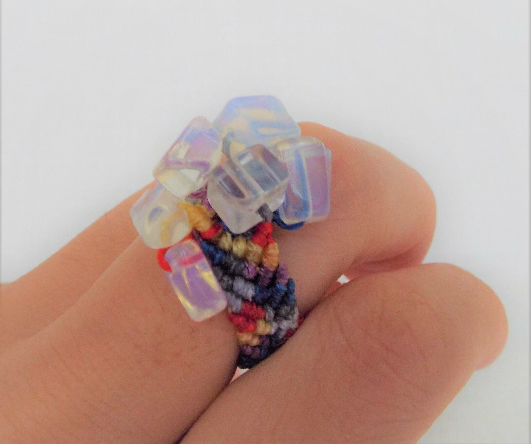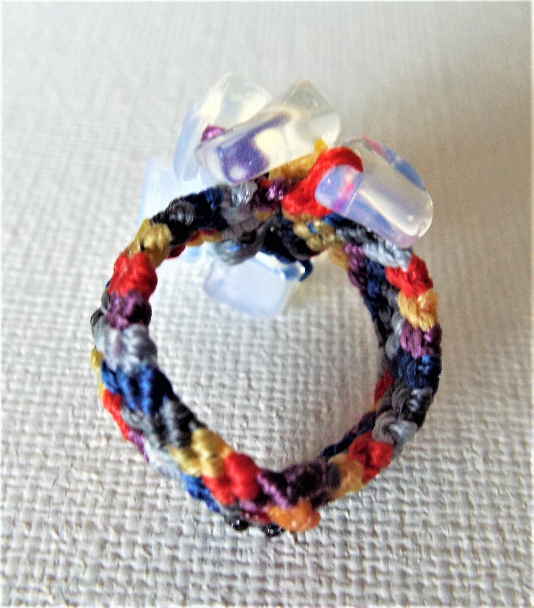白っぽい透明のビーズにを黄色、青、水色、茶色、赤のマクラメ糸で丁寧に編んでリングを作りました。