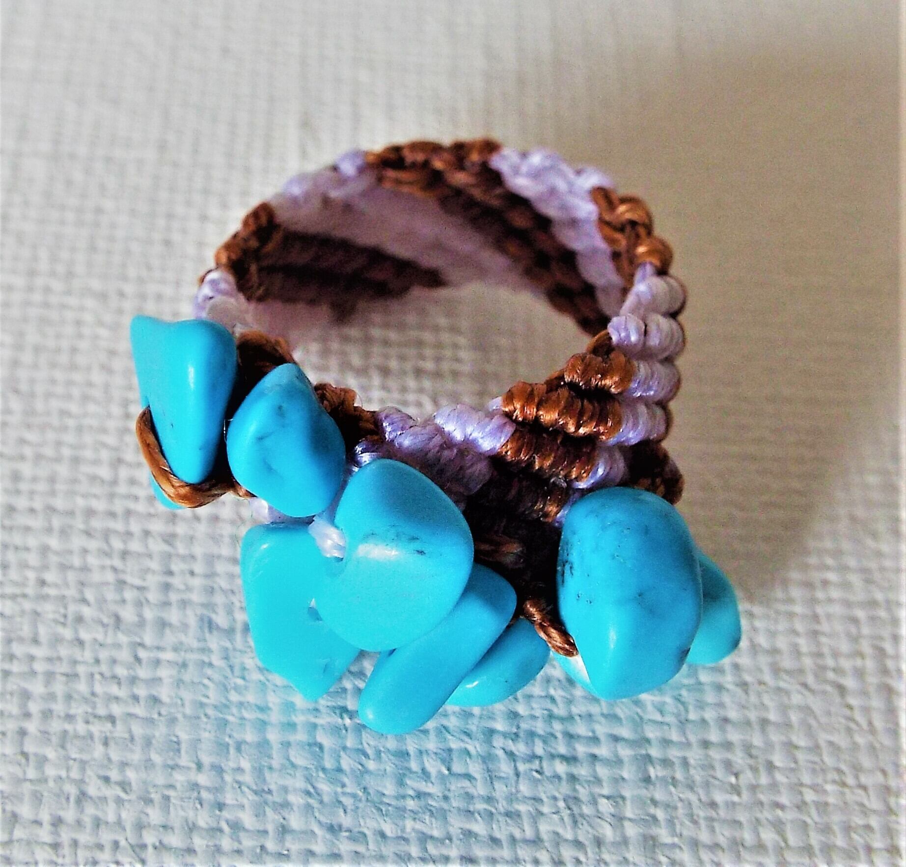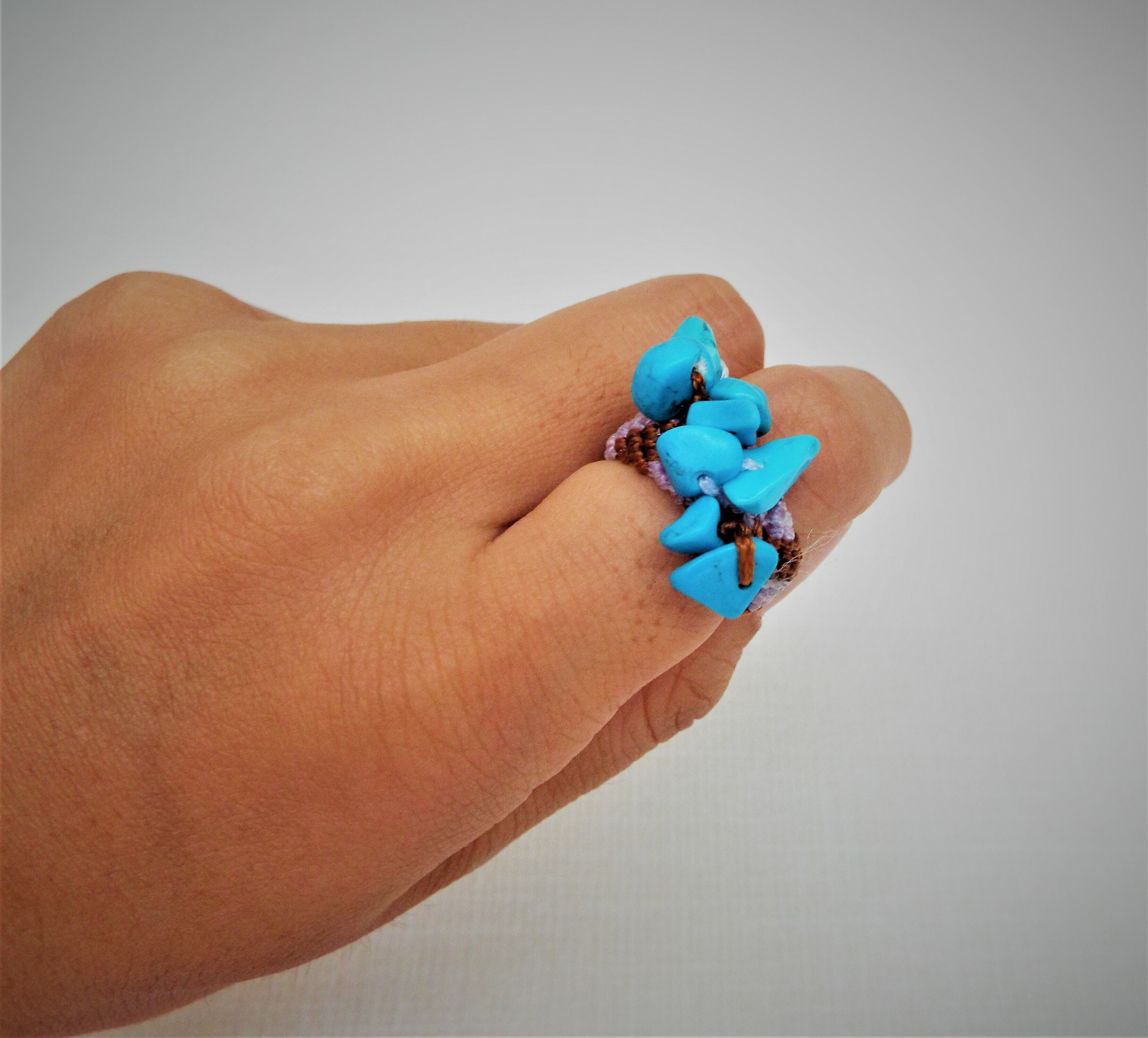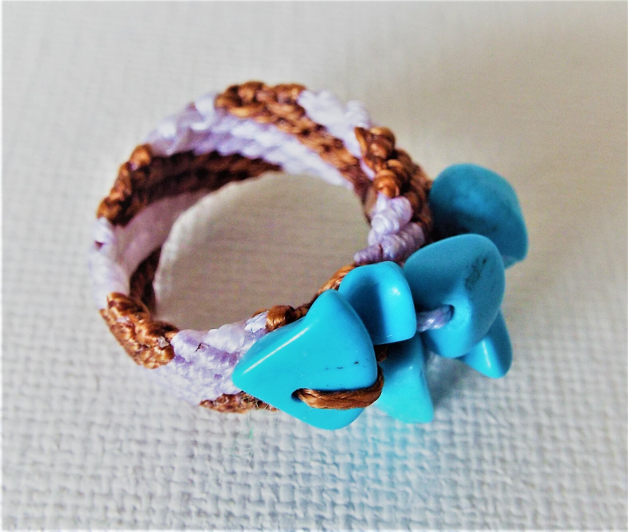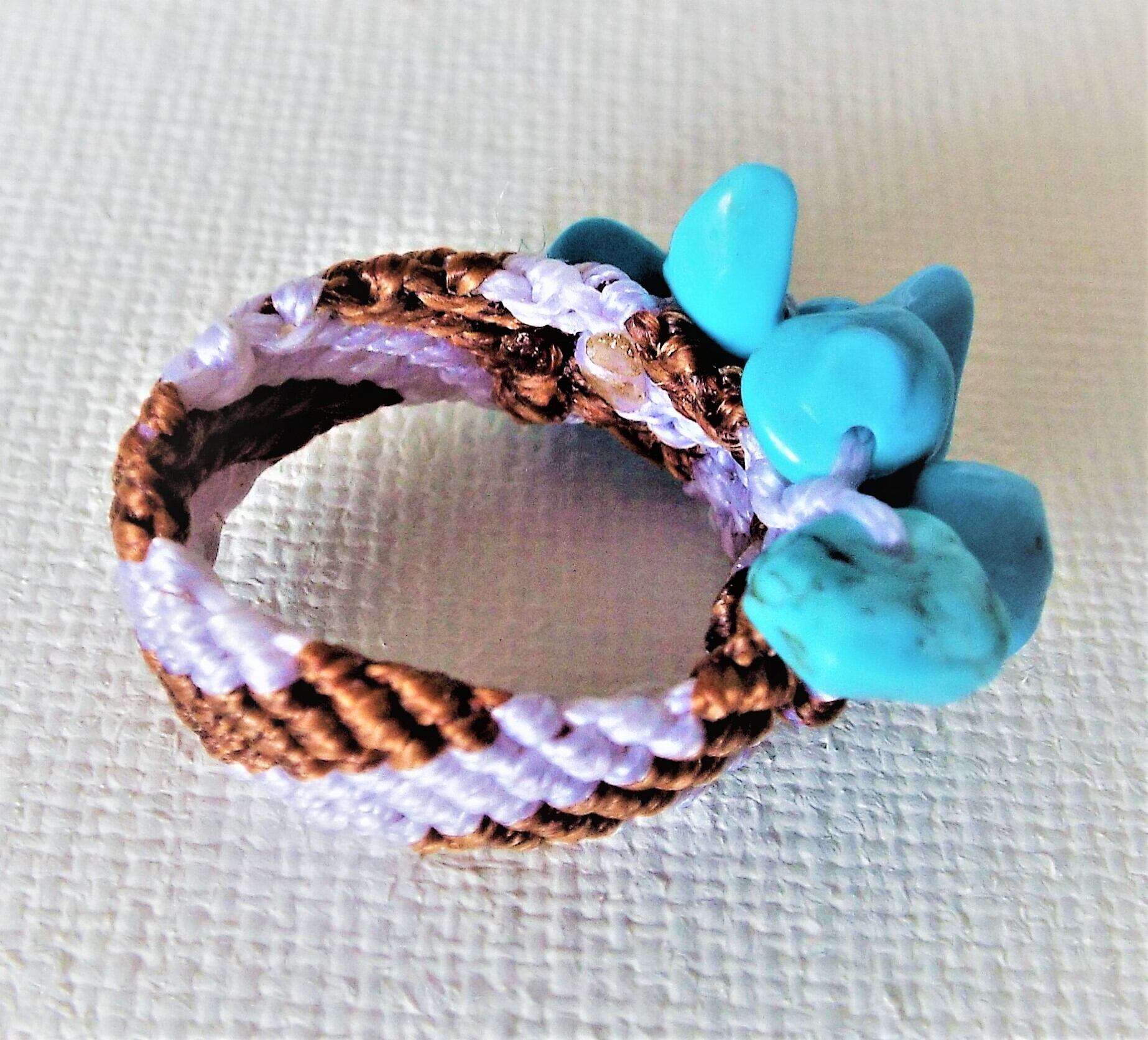 トルコ石風の石のビーズを白と茶色のマクラメ糸で丁寧に編んでリングを作りました。