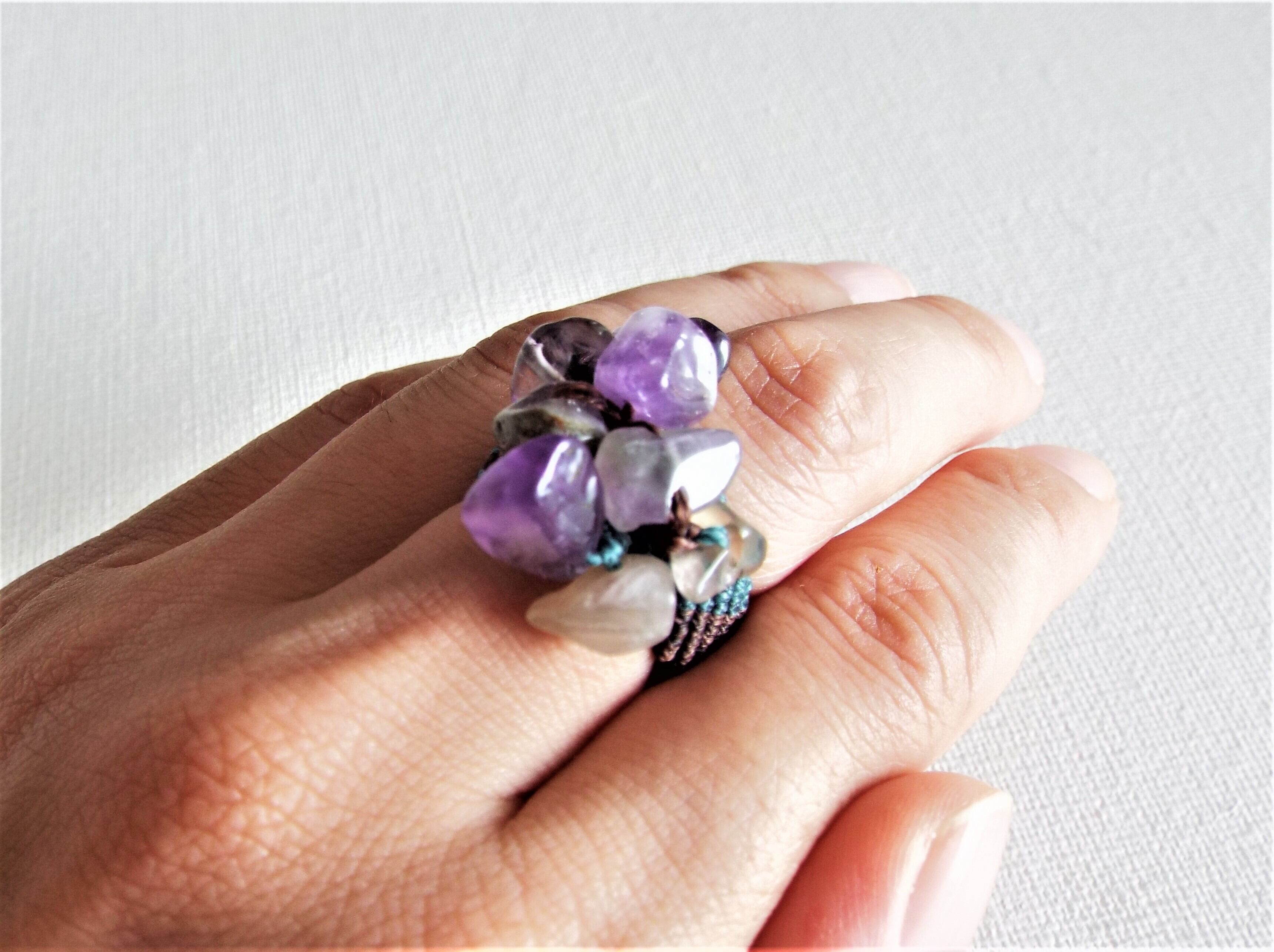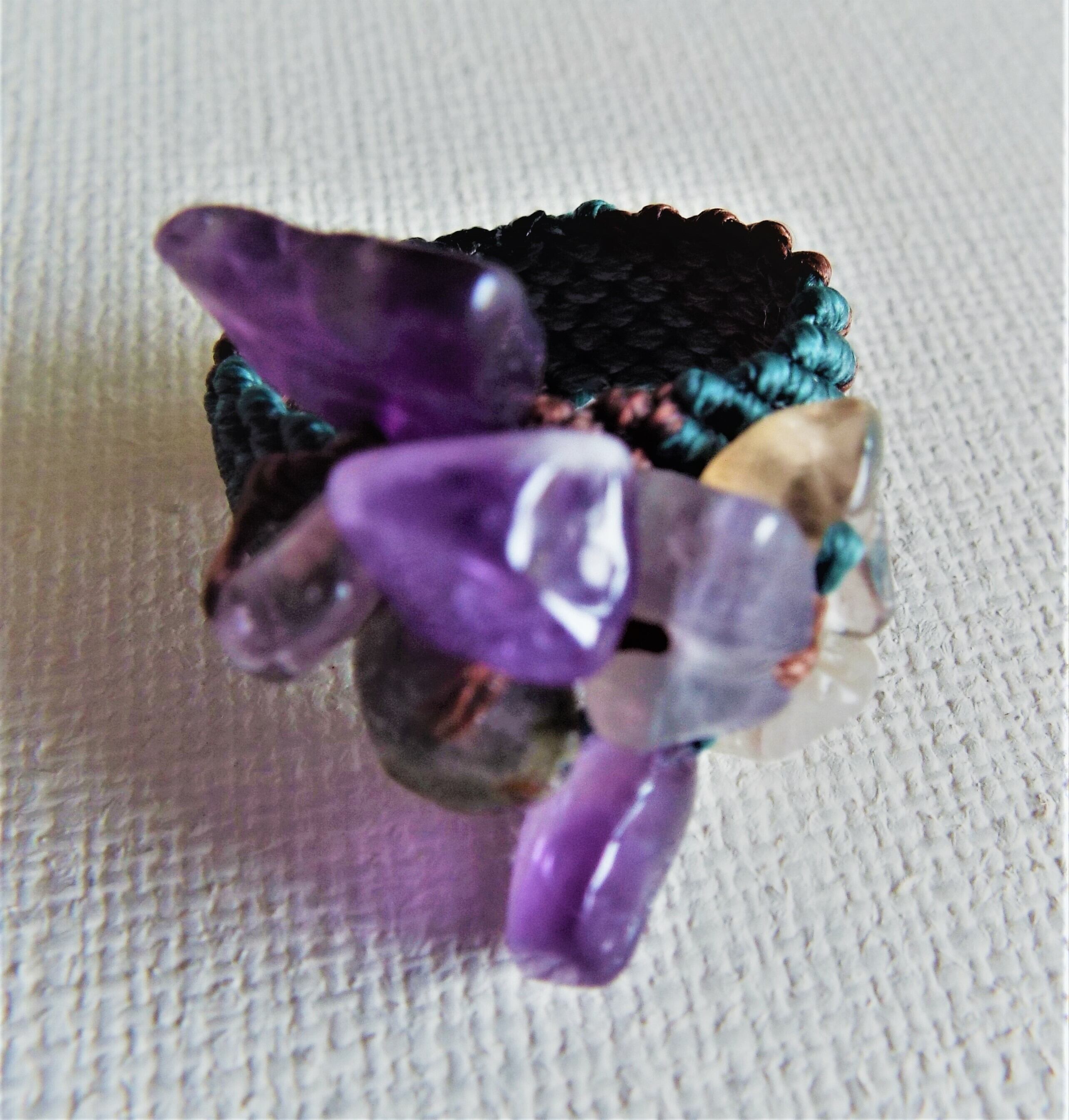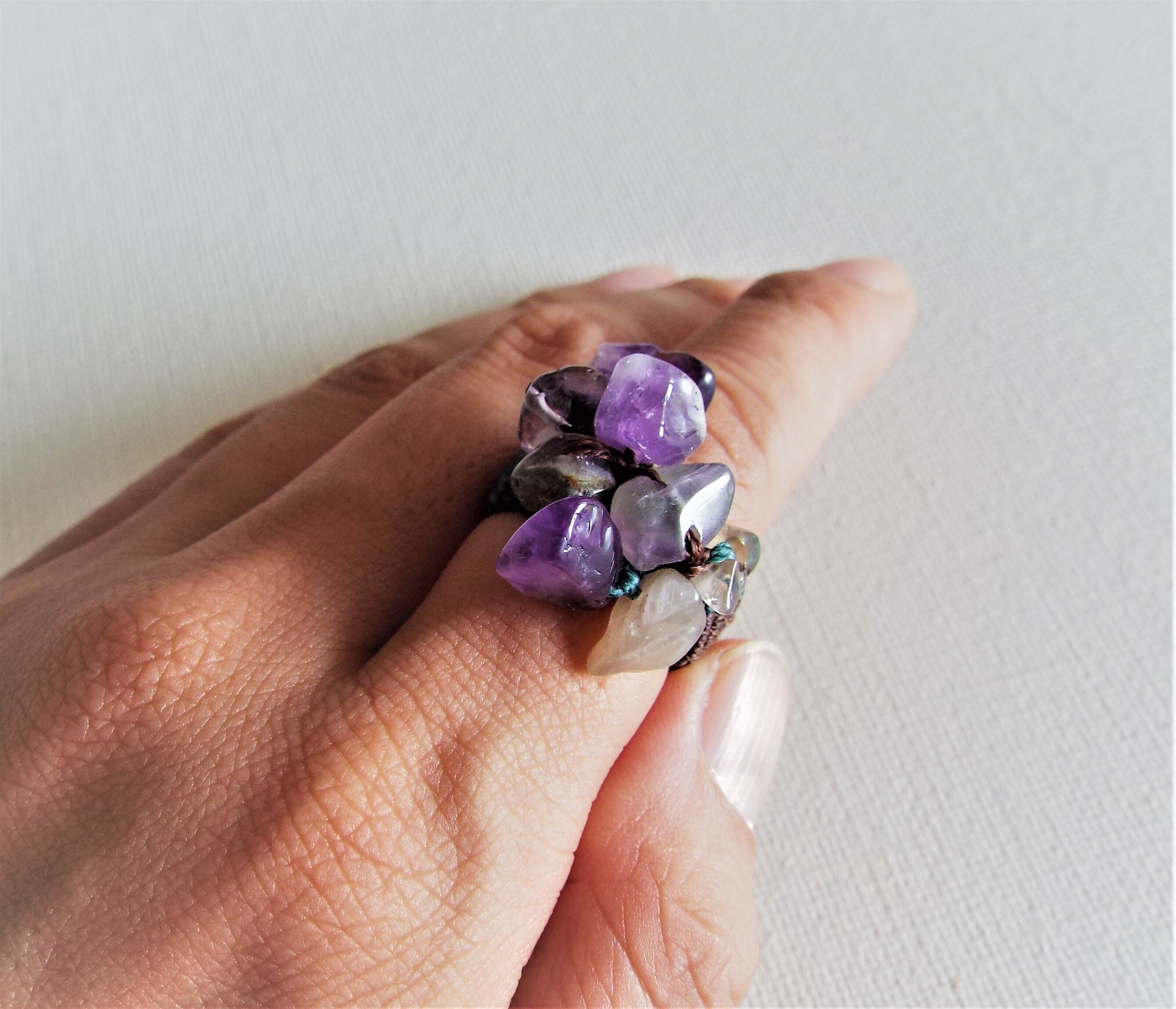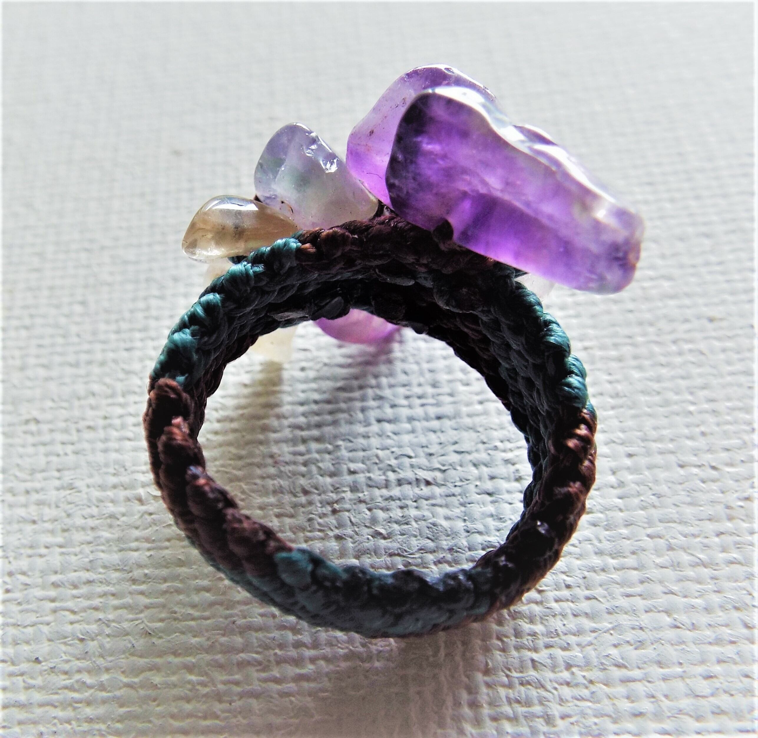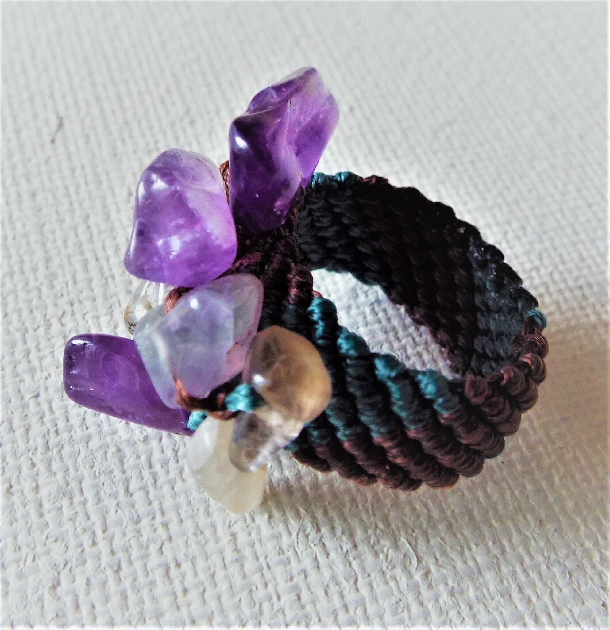 紫のビーズを緑と茶色のマクラメ糸で丁寧に編んでリングを作りました。